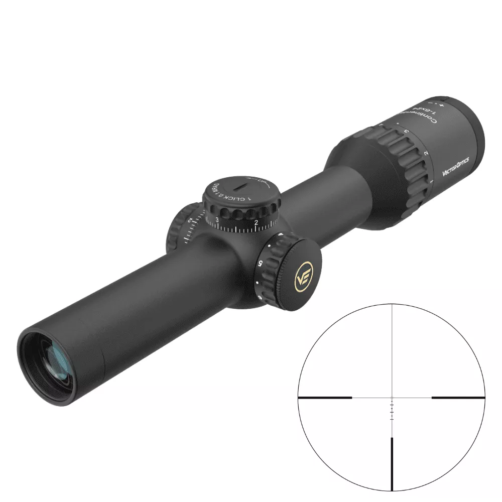 Прицел VectorOptics Continental 1-6x24 Tactical — профессиональный «загонник» с превосходной обзорностью, кристально чистой картинкой, тактическими барабанами выверки и баллистической сеткой с регулируемой подсветкой центра. Подходит для быстрого поиска и темповой стрельбы, охоты в загоне и с подхода, в том числе в условиях пониженной освещённости.