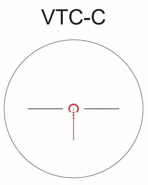 Вытравленная сетка VTC-C MIL — адекватный вариант для загона и ходовой охоты: «полукруг» — для быстрого захвата, «точка» — для точного прицеливания. Марка находится в I фокальной плоскости (FFP), т. е. угловые значения элементов верны при любой кратности. Нижняя направляющая размечена с шагом 100 ярдов (от 200 до 600 ярдов), что позволяет вносить поправки на дальность в пределах 550 м. Центральная часть метки подсвечивается красным, для лучшего отображения в сумерках и на тёмном фоне, а 6 уровней позволят отрегулировать яркость с учётом внешней освещённости. Выключать подсветку можно без полной прокрутки барабанчика до «нулевой» отметки — достаточно переключиться в промежуточное положение, отмеченное «точкой».