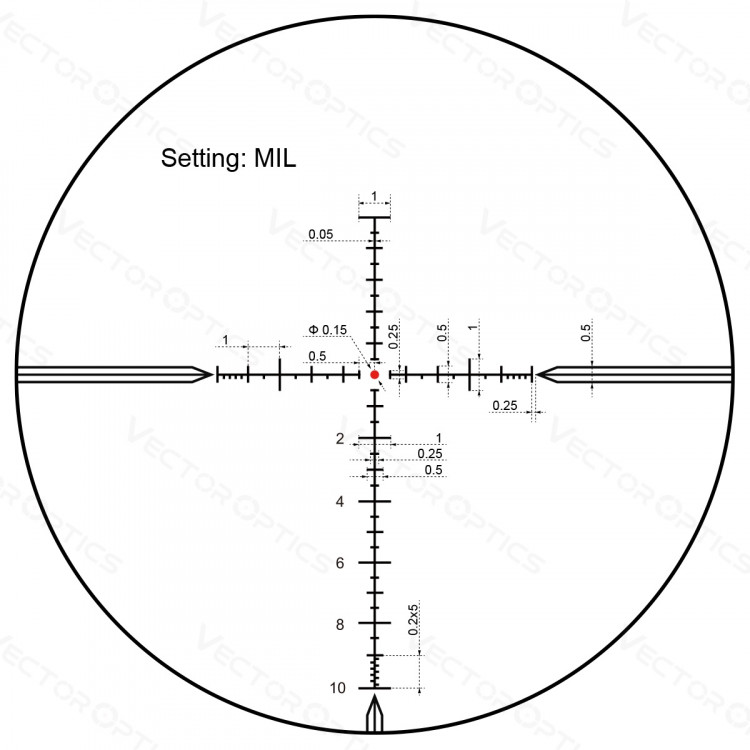 Масштабируемая сетка MPX1. Прицельная марка — одна из модификаций Half Mil-Dot для высокоточной стрельбы: с разметкой перекрестья с шагом 0,2 и 0,5 мил, расширенным до 10 мил диапазоном для поправок на дальность и «плавающей» точкой ø0,15 мил. Находится в 1 фокальной плоскости (FFP), а значит, меняется только внешне, не меняясь в угловых значениях, что позволяет точно оценивать расстояние и удерживать цель на любом уровне масштабирования.