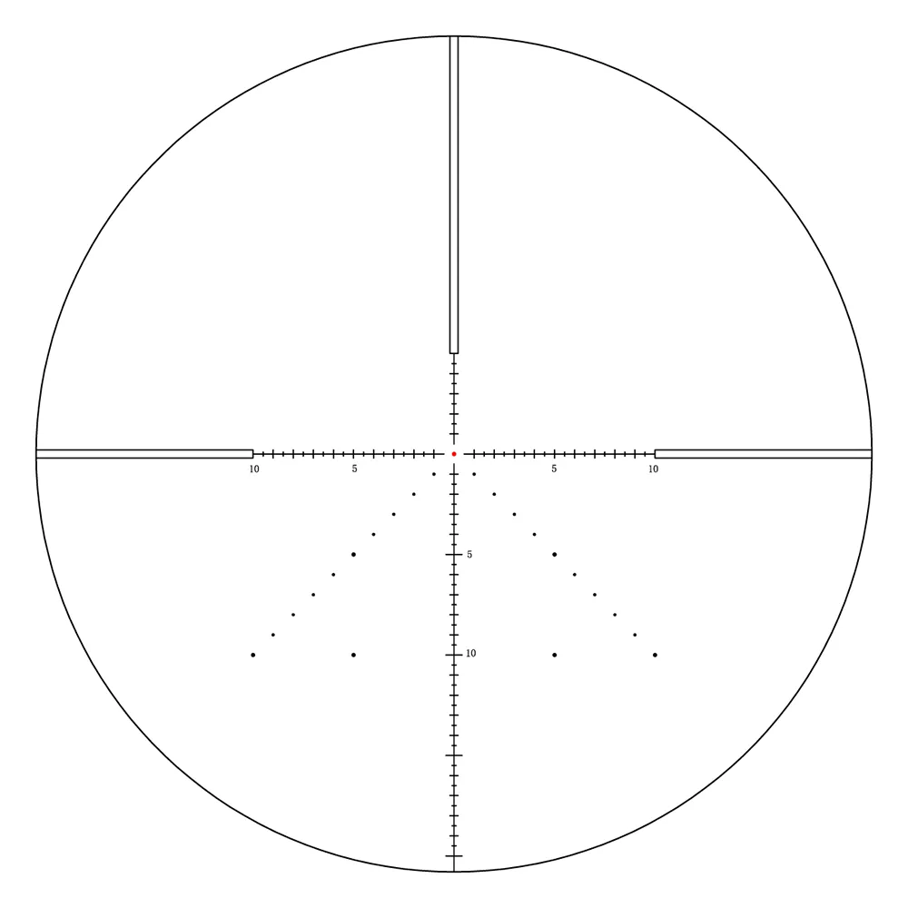 Выгравированная прицельная сетка MPR-V5 — модифицированный «правильный» МилДот: расширенная разметка перекрестья с шагом 0,5 и 1 мил (по 10 мил влево/вправо, 40 мил вниз) и вертикальная мини-«ёлка» для стрельбы выносом, «плавающая» точка в центре для стрельбы навскидку. Марка очень тонкая, с полыми прицельными штрихами, на любой кратности цель не перекрывает, размеры не меняет (SFP), а поправки считаются при 8x. Точка Ø0,15mil подсвечивается красным: подсветка яркая, 6 уровней с быстрым промежуточным выключением, внимание привлекает, а в сумерках улучшает видимость не только центра, но и всей сетки.