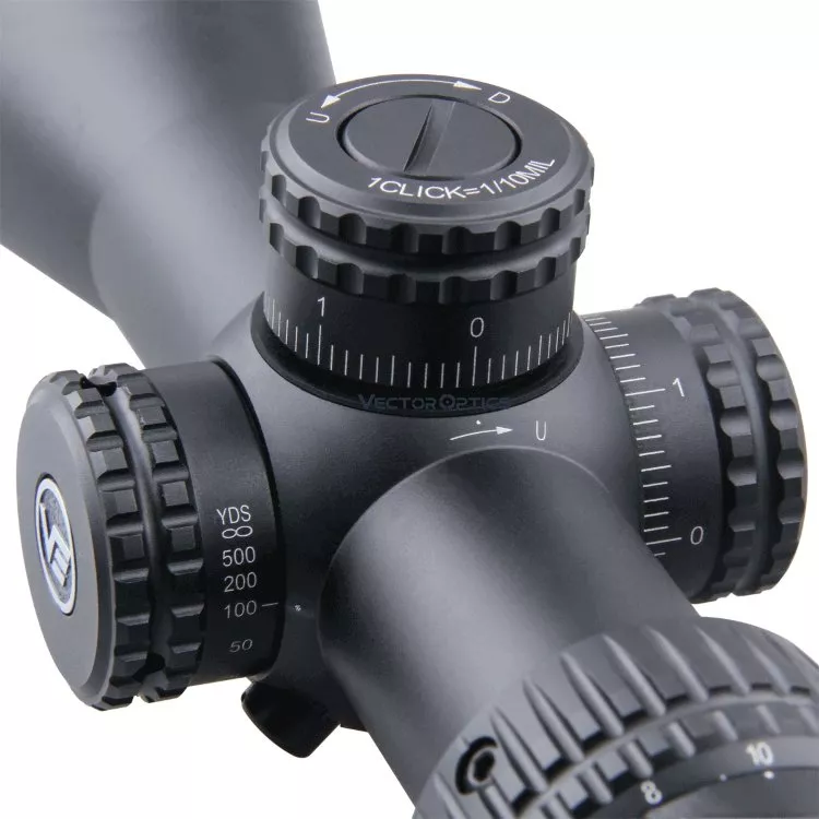 Открытые барабанчики выверки выполнены по типу тактических: достаточно высокие и удобные под руку в перчатке, с подпружиненной блокировкой от сбоя настроек (вращаются только в крайнем верхнем положении) и сбросом на «новый ноль». 100% возвращаемость СТП. Клики чёткие, с шагом 1/10 мил или 10 мм на 100 м, а поскольку система единиц та же, что и у сетки, сложных перерасчётов в процессе не будет.