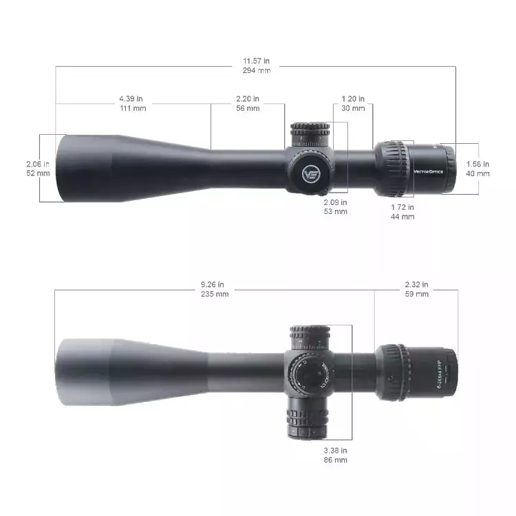 Корпус. От большинства аналогичных прицелов для пневматики Veyron 6-24x44 IR FFP (SCFF-37) отличается сравнительно небольшим весом (585 г) и укороченным (300 мм в длину) корпусом с диаметром трубы 30 мм. Прицел можно ставить и на лёгкую компактную пневматику (до 7,5 Дж) и на огнестрельное оружие под калибр 12, .30-06 и .308 Win, а высокая степень водо/пылезащиты позволяет работать с прибором во время дождя и не опасаться за нарушение герметичности при случайном падении в пресную воду на глубину до 1 м. Для комфортной стрельбы на ярком солнце рекомендуется использовать штатную бленду-рассекатель.