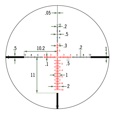 - Четкая прицельная сетка (вытравленая на стекле оптического элемента) с 10-уровневой системой подсветки, обеспечивающей включение подсветки на уровне, установленном до ее выключения;