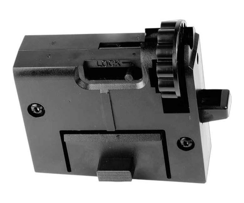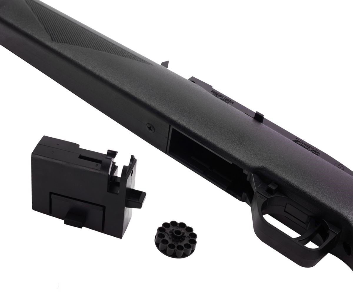 Корпус изготовлен из жесткого пластика - это около 80% винтовки, но изделие и его детали очень прочные и надежные, а ствол сделан из стали. Внутри ствола 9 нарезов правостороннего типа. Детали УСМ, ствольная коробка, ложе выполнены из крепкого полиамидного материала, а изготовление магазина и неответственных деталей УСМ - из полистирола, кроме того наличие деталей из гибкого полипропиленового материала.