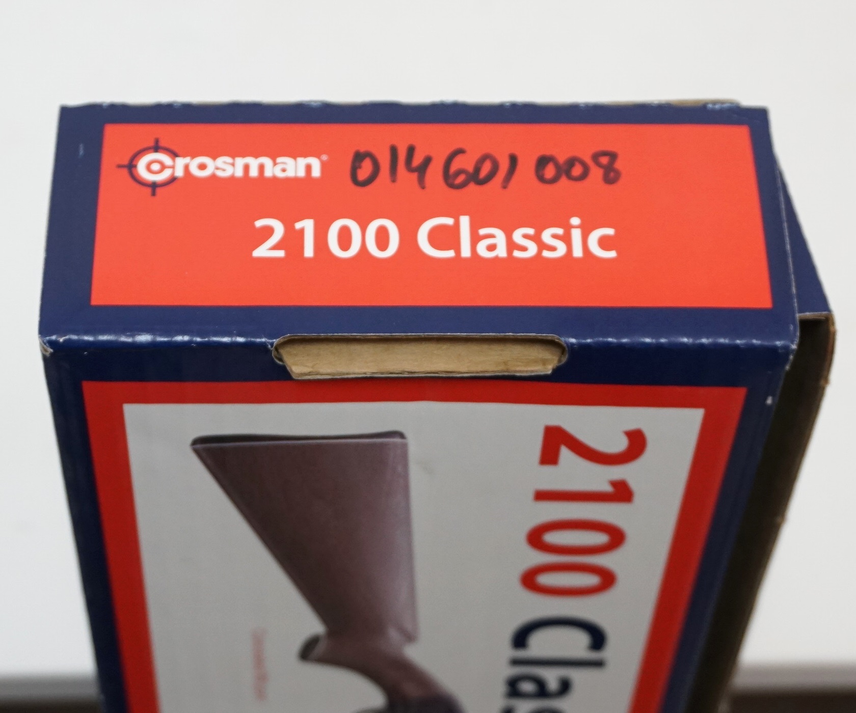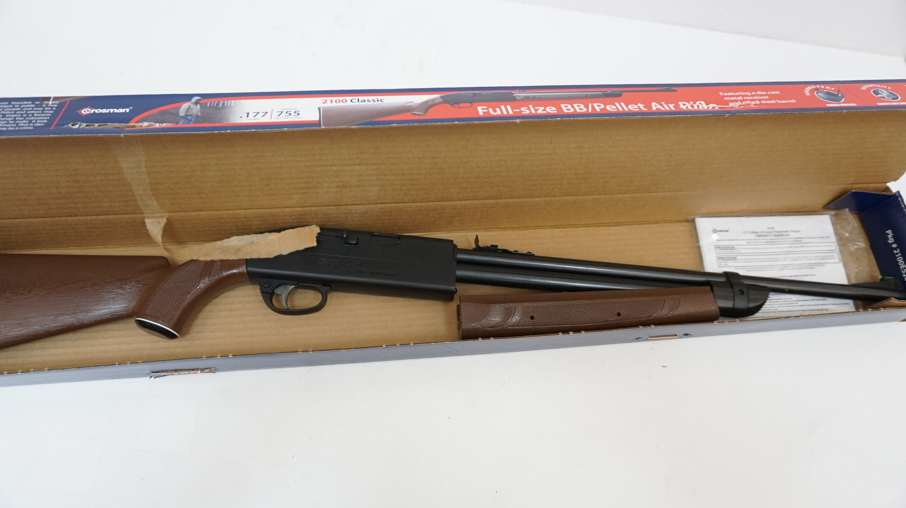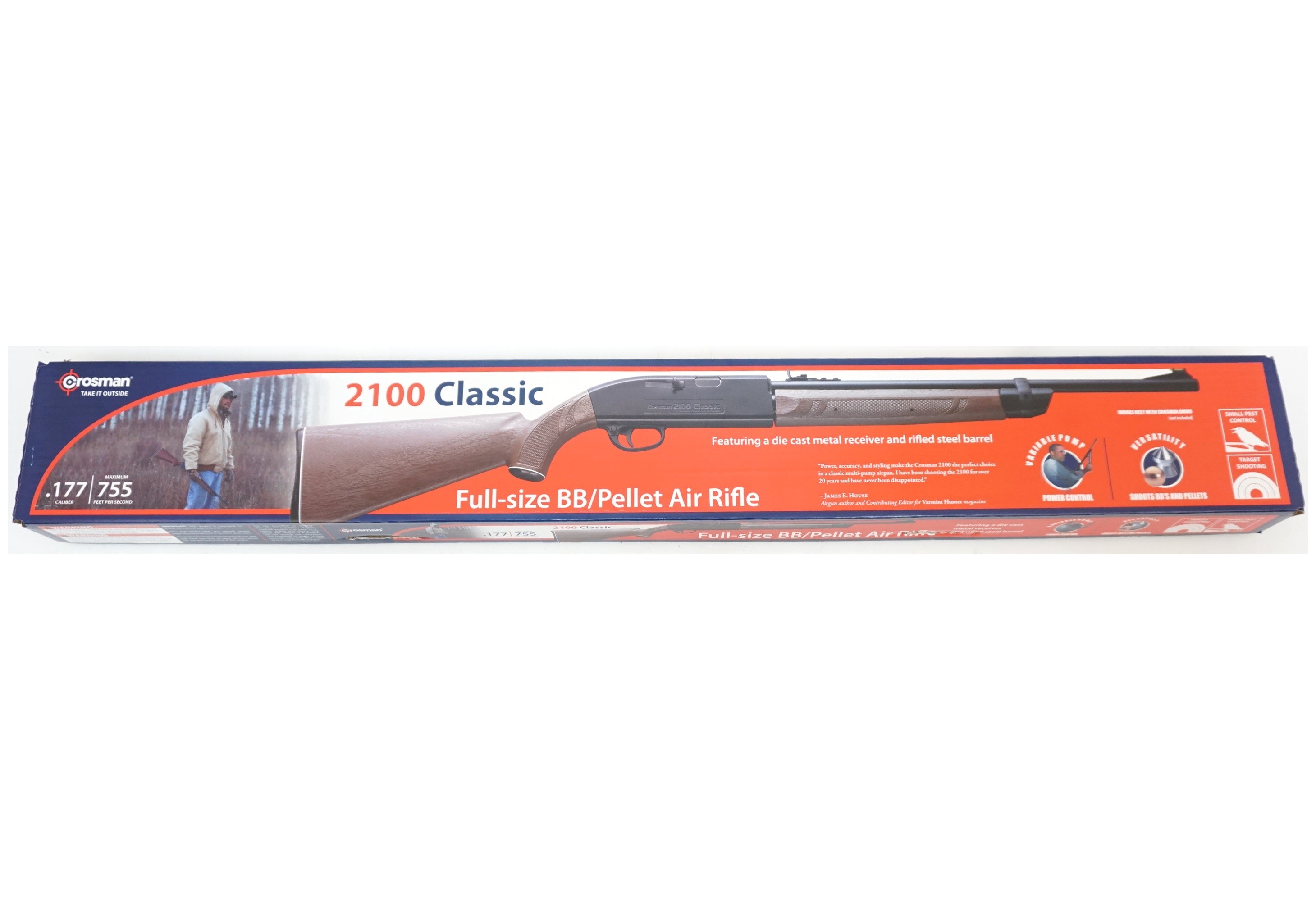 Crosman 2100 B является пневматической мультикомпрессионной винтовкой калибра 4,5 мм. Давление воздуха, нужное для производства выстрела, создается посредством предварительной ручной накачки «насоса» специального накопителя. В среднем для накачки надо 8-12 движений. Такие винтовки не имеют недостатков, свойственных пружинно-поршневым аналогам - инерции поршней, отдачи, при этом СО2 винтовки хуже тем, что баллон с газом ограничивает количество выстрелов. Пневматическая винтовка Crosman 2100 B позволяет стрелять свинцовыми пулями и омедненными шариками из стали обозначенного калибра. Число шариков для стрельбы составляет до 200 в магазине-бункере, размещённом прямо в рукоятке. Изначальная скорость пули, которая заявлена производителем, - 230 м/с, если стрелять шариком ВВ, и она составляет 221 м/с, если стрелять свинцовой пулей. Скорость пули прямо зависит от числа движений для накачки. Масса и форма пули тоже влияют на скорость выстрела и его точность. Масса винтовки Crosman 2100 B - 2,18 кг, её общая длина 1010 мм. Лёгкий вес данной винтовки позволяет её брать с собой при отправлении на природу, где можно с ней успешно охотиться. Сама винтовка сбалансированная и прикладистая, стрелять из неё удобно, поскольку отдачи почти нет. Её ложе и цевье созданы из прочного коричневого пластика, их можно при разборке отделить от основы. Прицельные приспособления принадлежат к открытому типу, мушка лишена намушника, целик регулируется по высоте и по горизонту. В тыльной части ствольной коробки находится «ластохвост» - это специальный кронштейн для крепления прицела оптического либо коллиматорного.