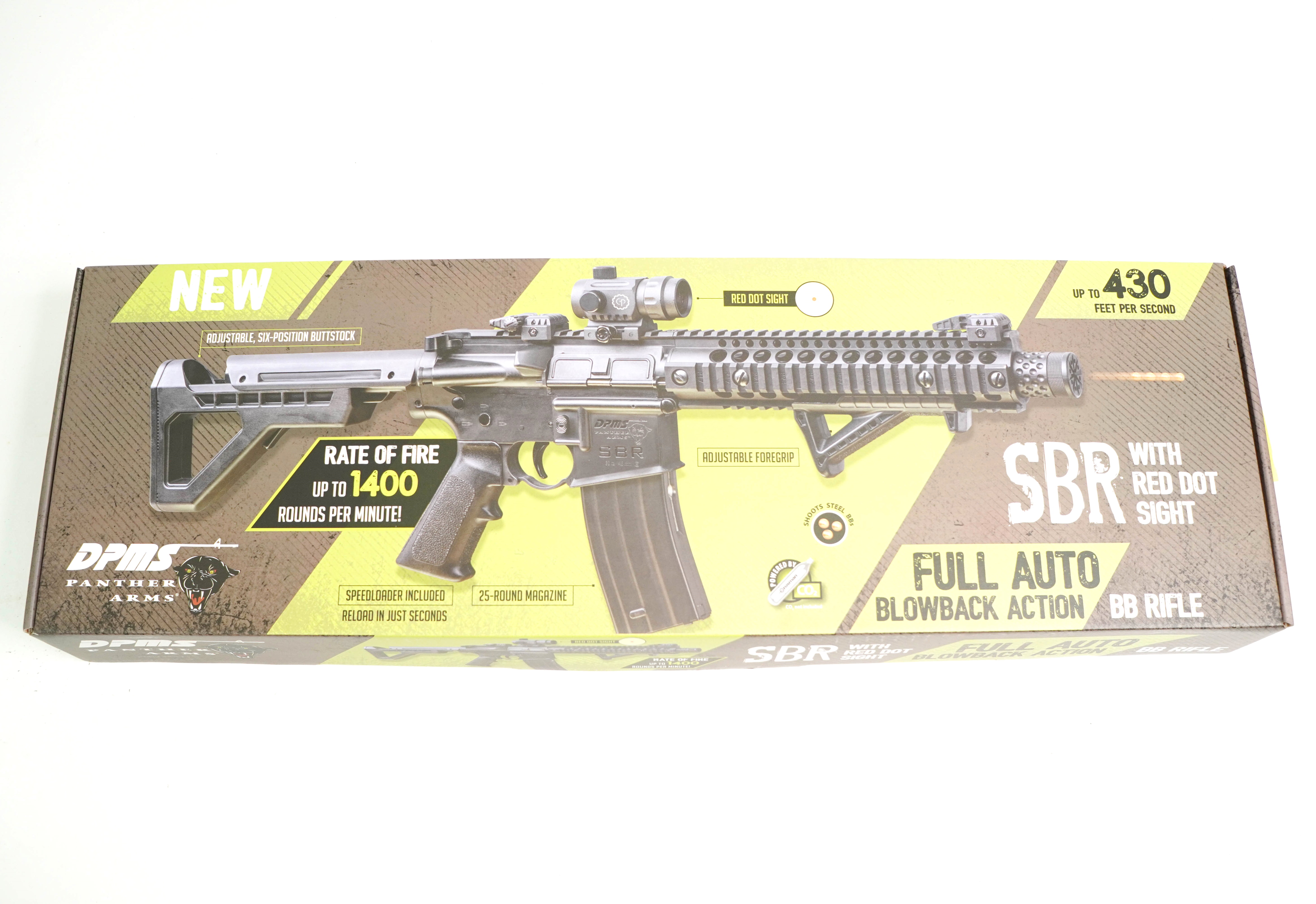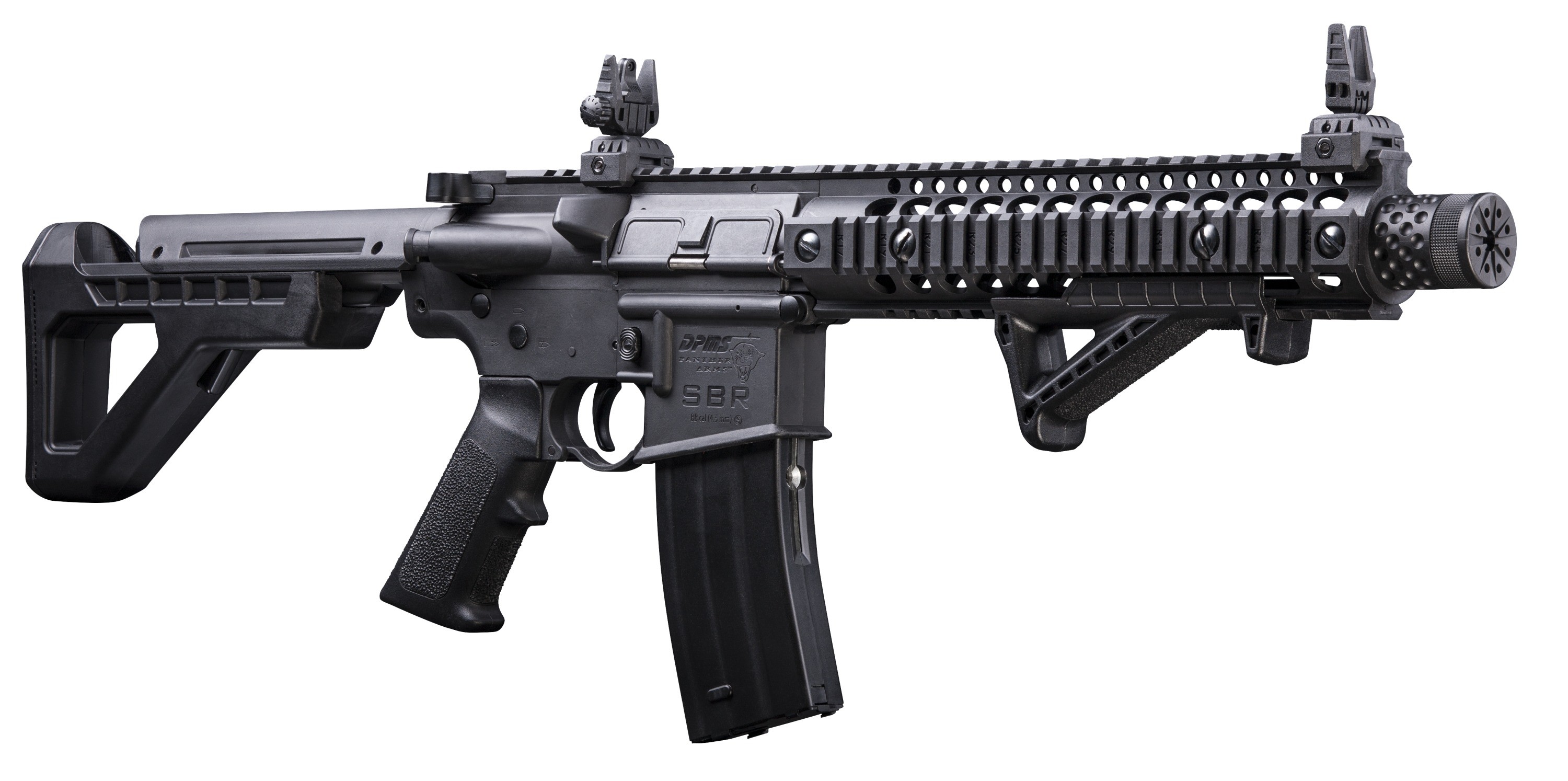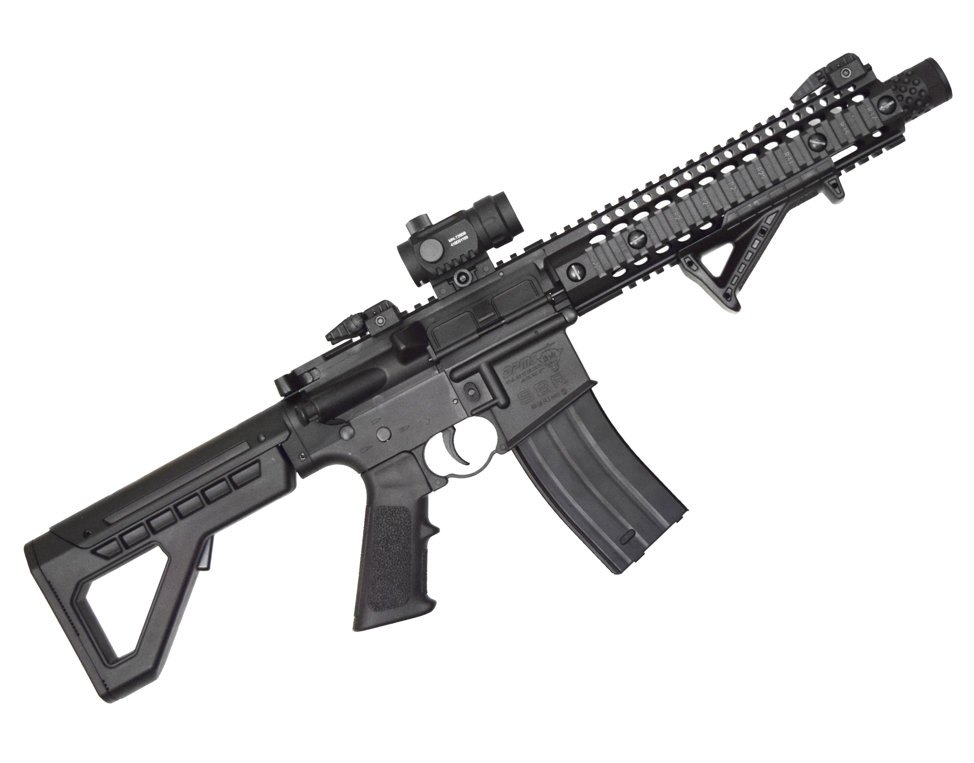 Пневматическая винтовка Crosman DPMS SBR Full Auto – это газобаллонная разработка с режимом автоматического огня на основе штурмовой винтовки М4. Данная модификация, как и огнестрельный прототип, сохранила подвижность затвора, а также кнопки досылания боеприпаса. Кроме того, крышка выброса гильзы в этой модели также активная. Преимущество автомата Crosman DSBRX еще и в его отличном темпе стрельбы – при использовании режима «автоматический огонь» он «выдает» до 1400 выстрелов за минуту. Энергию боеприпасам сообщают два баллончика с углекислым газом, находящиеся в пистолетной рукоятке. Емкость магазина 30 шариков ВВ – именно такие боеприпасы использует данная модель. Скорость выстрела – порядка 130 м/с. Ствол гладкий, имеется неавтоматический предохранитель. Присутствуют механические открытые прицельные приспособления (прицел Buis), складного типа, а при необходимости есть возможность установки оптики – предусмотрены несколько направляющих для оптики и дополнительных приспособлений. Все ответственные элементы винтовки выполнены из оружейной стали, корпус и приклад из прочного полимера. Съемная тактическая рукоятка установлена с удобным уклоном для комфортного удержания оружия. Тактический приклад имеет 6 положений. Габаритные размеры отвечают огнестрельному образцу – длина с разложенным прикладом 72,2 см, а вес 2,95 кг. Комплектуется винтовка коллиматорным прицелом, лоадером, магазином и инструкцией.
