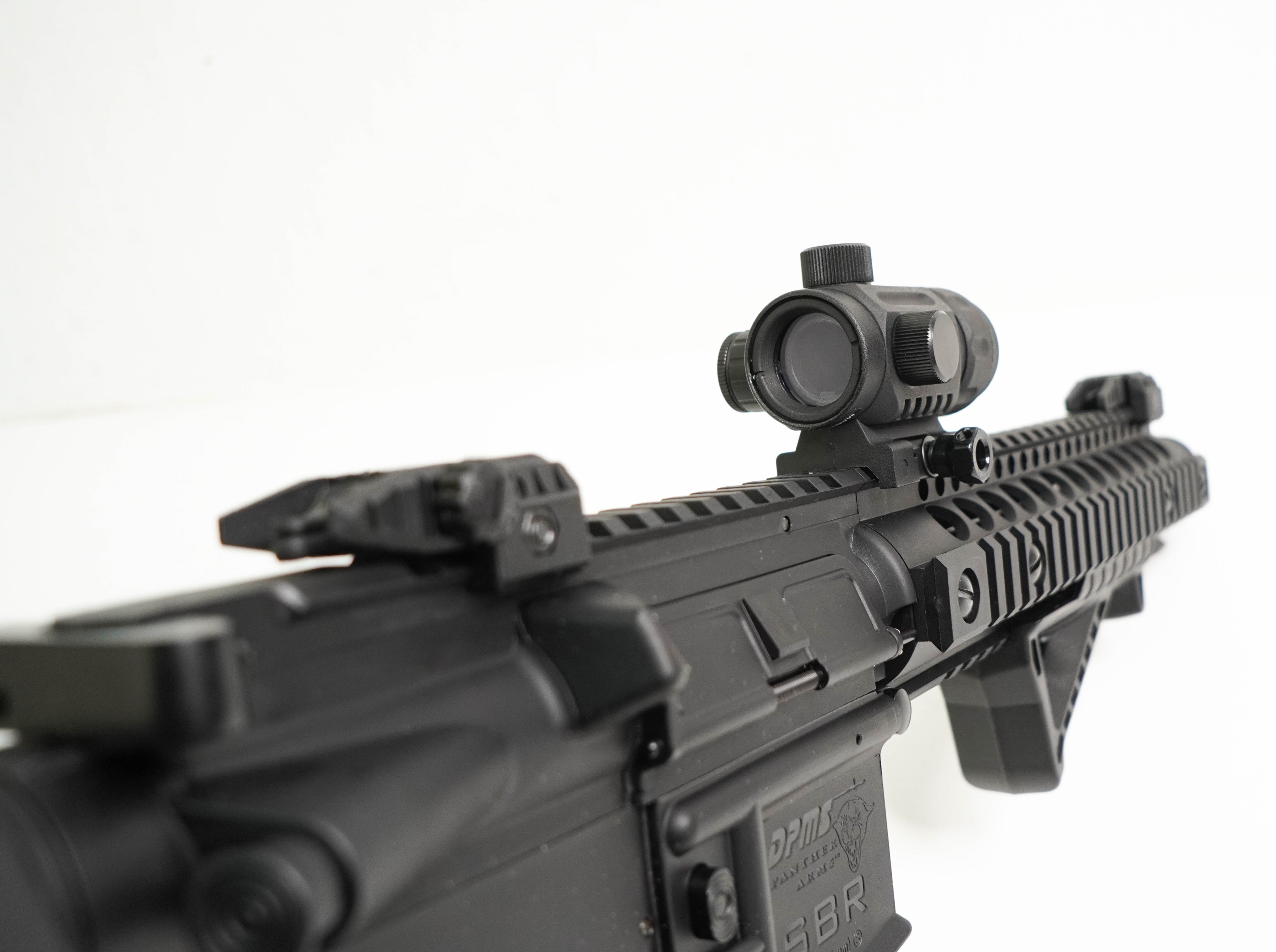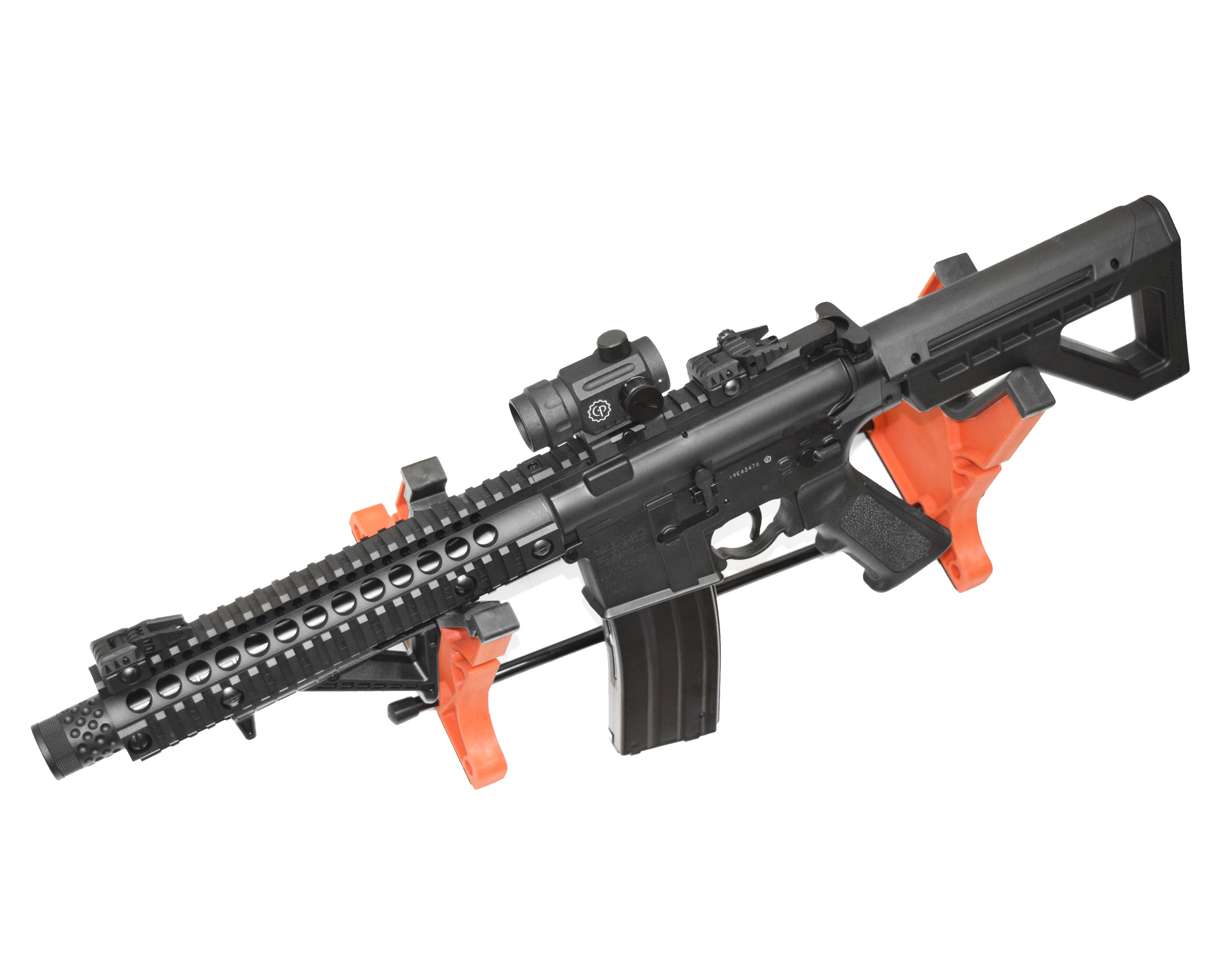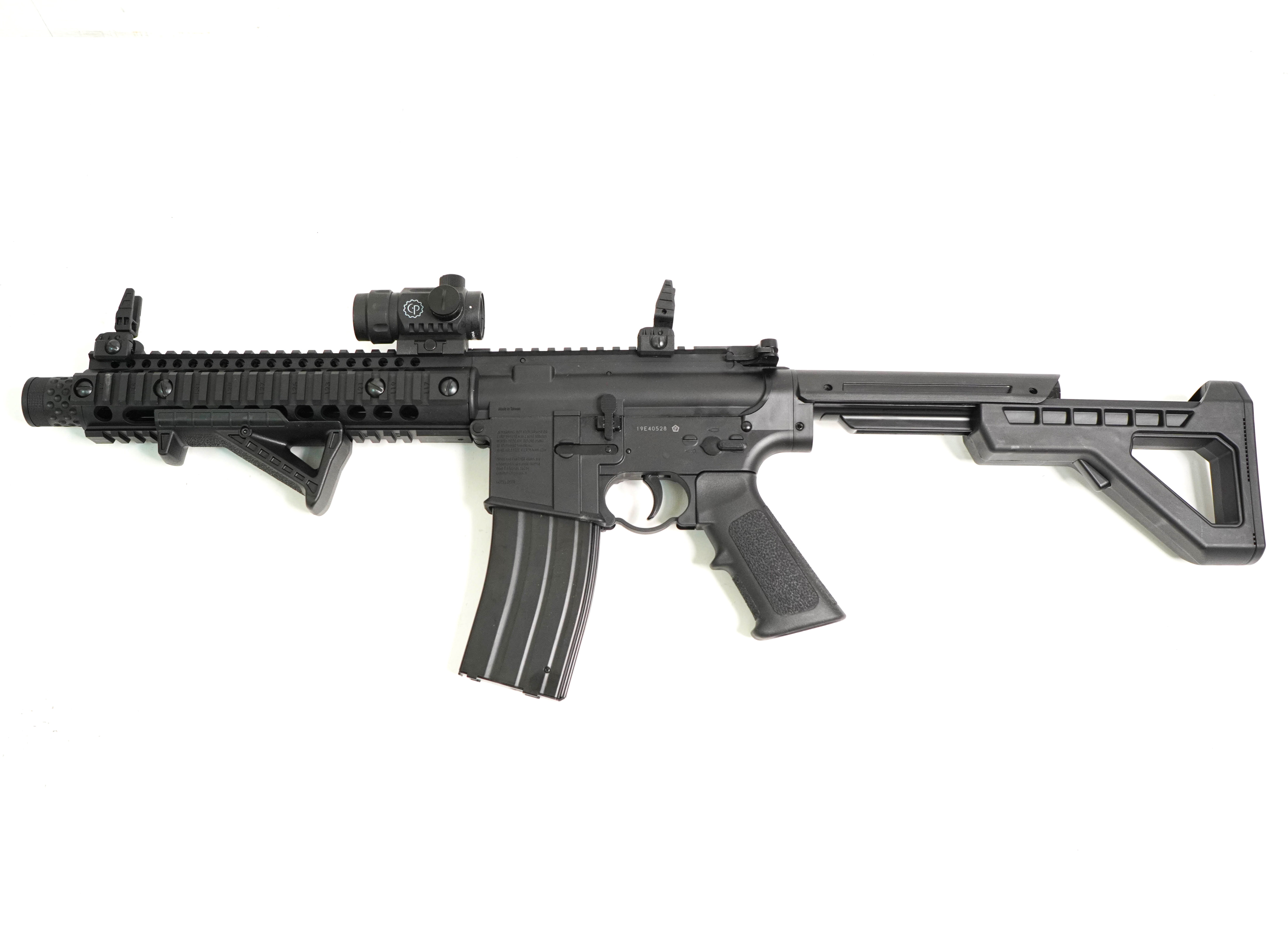 Пневматическая винтовка Crosman DPMS SBR Full Auto – это газобаллонная разработка с режимом автоматического огня на основе штурмовой винтовки М4. Данная модификация, как и огнестрельный прототип, сохранила подвижность затвора, а также кнопки досылания боеприпаса. Кроме того, крышка выброса гильзы в этой модели также активная. Преимущество автомата Crosman DSBRX еще и в его отличном темпе стрельбы – при использовании режима «автоматический огонь» он «выдает» до 1400 выстрелов за минуту. Энергию боеприпасам сообщают два баллончика с углекислым газом, находящиеся в пистолетной рукоятке. Емкость магазина 30 шариков ВВ – именно такие боеприпасы использует данная модель. Скорость выстрела – порядка 130 м/с. Ствол гладкий, имеется неавтоматический предохранитель. Присутствуют механические открытые прицельные приспособления (прицел Buis), складного типа, а при необходимости есть возможность установки оптики – предусмотрены несколько направляющих для оптики и дополнительных приспособлений. Все ответственные элементы винтовки выполнены из оружейной стали, корпус и приклад из прочного полимера. Съемная тактическая рукоятка установлена с удобным уклоном для комфортного удержания оружия. Тактический приклад имеет 6 положений. Габаритные размеры отвечают огнестрельному образцу – длина с разложенным прикладом 72,2 см, а вес 2,95 кг. Комплектуется винтовка коллиматорным прицелом, лоадером, магазином и инструкцией.