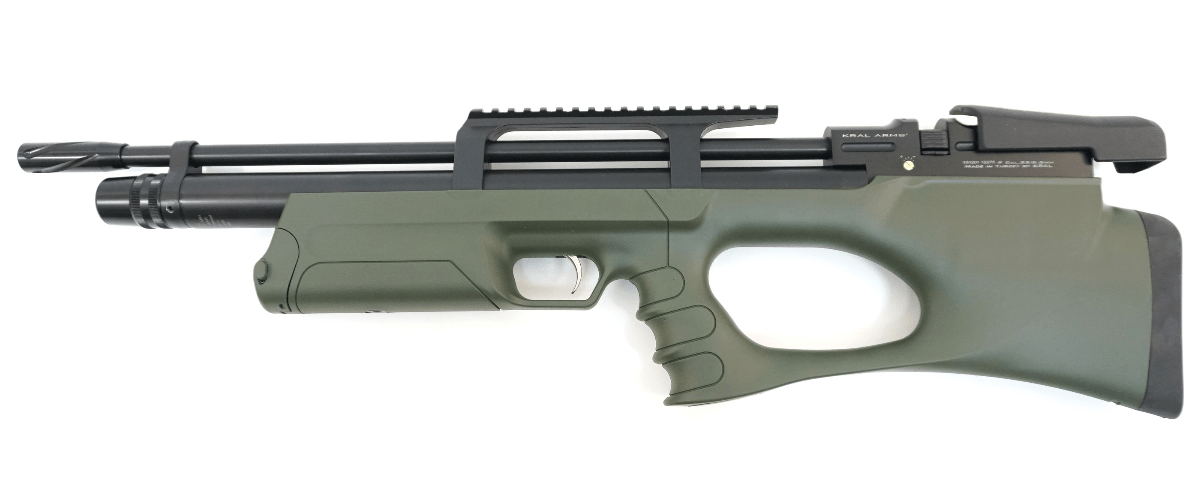 Без проведения усиления, со штатной иглой скорость выстрела составляет 100 м/с, после усиления – до 300 м/с. Модель имеет приклад типа «булл-пап» укороченной длины, что не сказывается негативно на точности стрельбы. Ортопедическая форма приклада и ультрамягкий амортизирующий затыльник, сводят отдачу от выстрела до минимума. Величина дульной энергии – менее 3 Дж, купить винтовку Крал Панчер Брекер может каждый желающий. Механизм спуска здесь регулируется, взвод биатлонный. Магазин винтовки барабанного типа, рассчитан на 10 единиц боеприпасов. Стреляет Kral Puncher Breaker стандартными пулями для пневматики увеличенного калибра 6,35 мм.