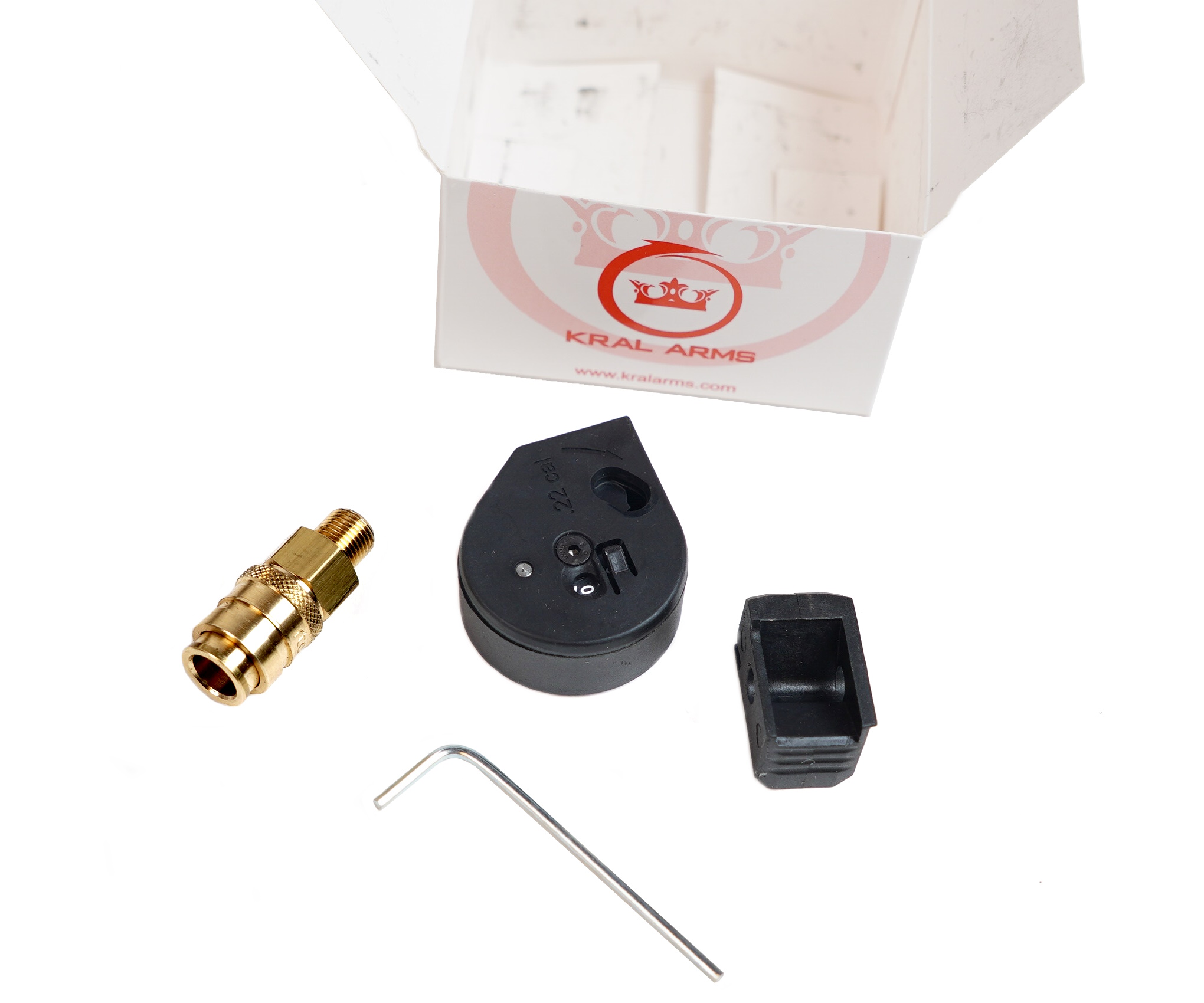 Kral Puncher Empire X предназначена для стрельбы свинцовыми пулями калибра 6.35 мм. В комплекте с винтовкой поставляется 12-зарядный магазин-барабан, который устанавливается в отсек приемника ствольной коробки. Перед каждым выстрелом пневматику необходимо взвести путем оттягивания рукояти затвора, которая расположена на центральной части корпуса с правой стороны.
