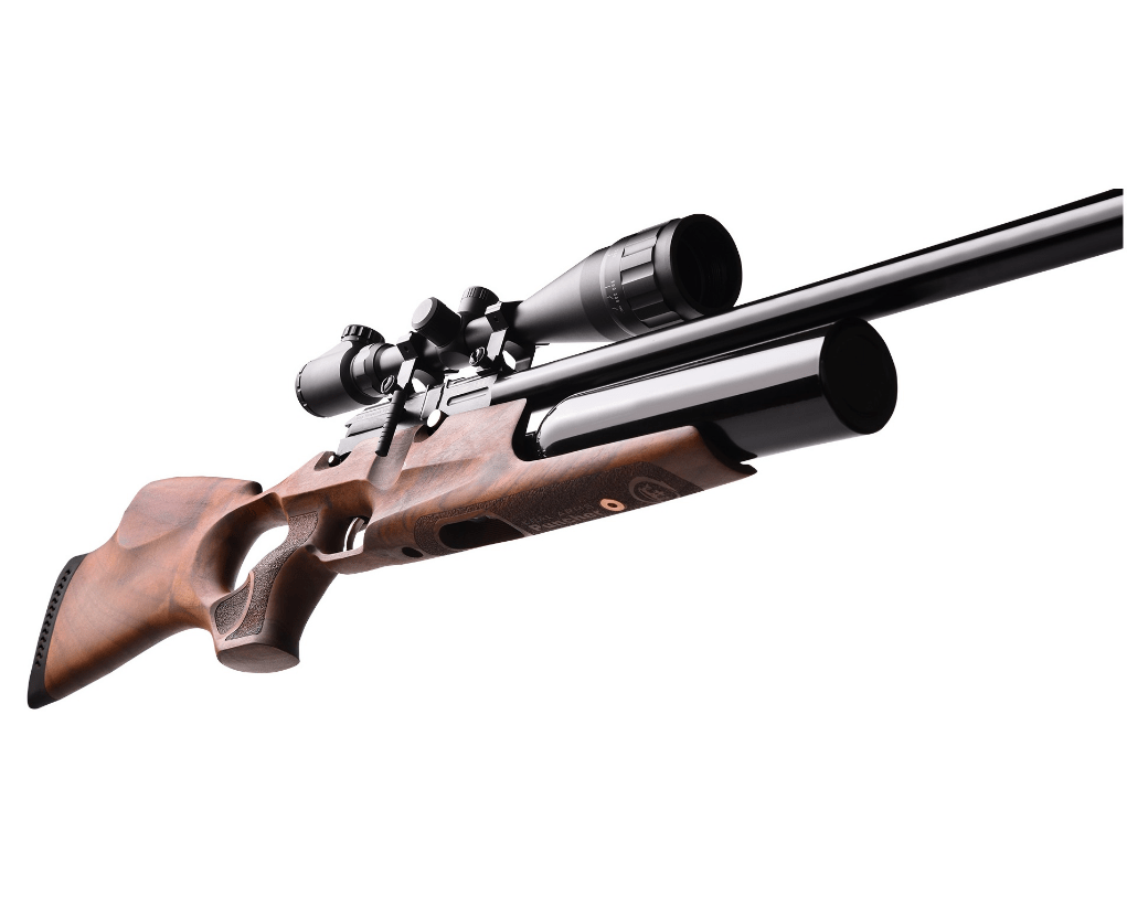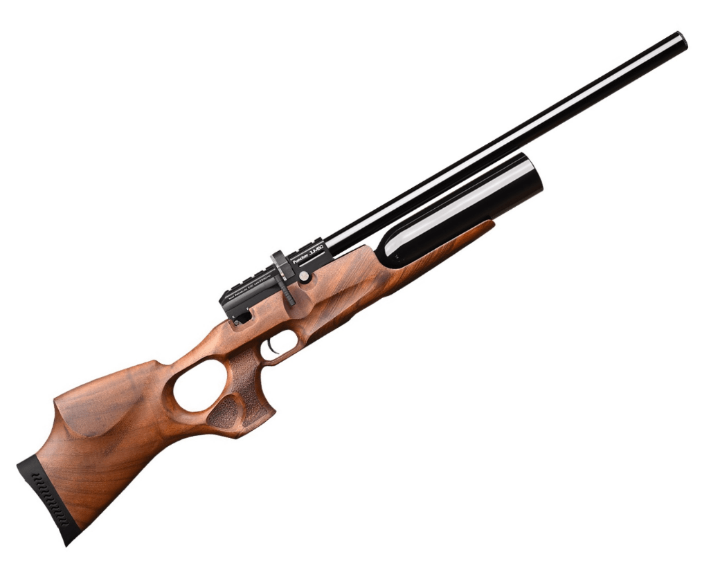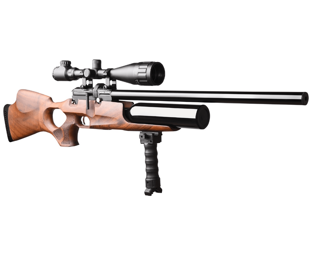 – это изделие классического дизайна разработка с увеличенным объемом резервуара и безупречным качеством сборки. Винтовка обладает резервуаром на 425 куб.см. воздуха, который и является ее движущей силой. Резервуар привычно расположен под стволом и снабжен манометром для контроля количества воздуха.