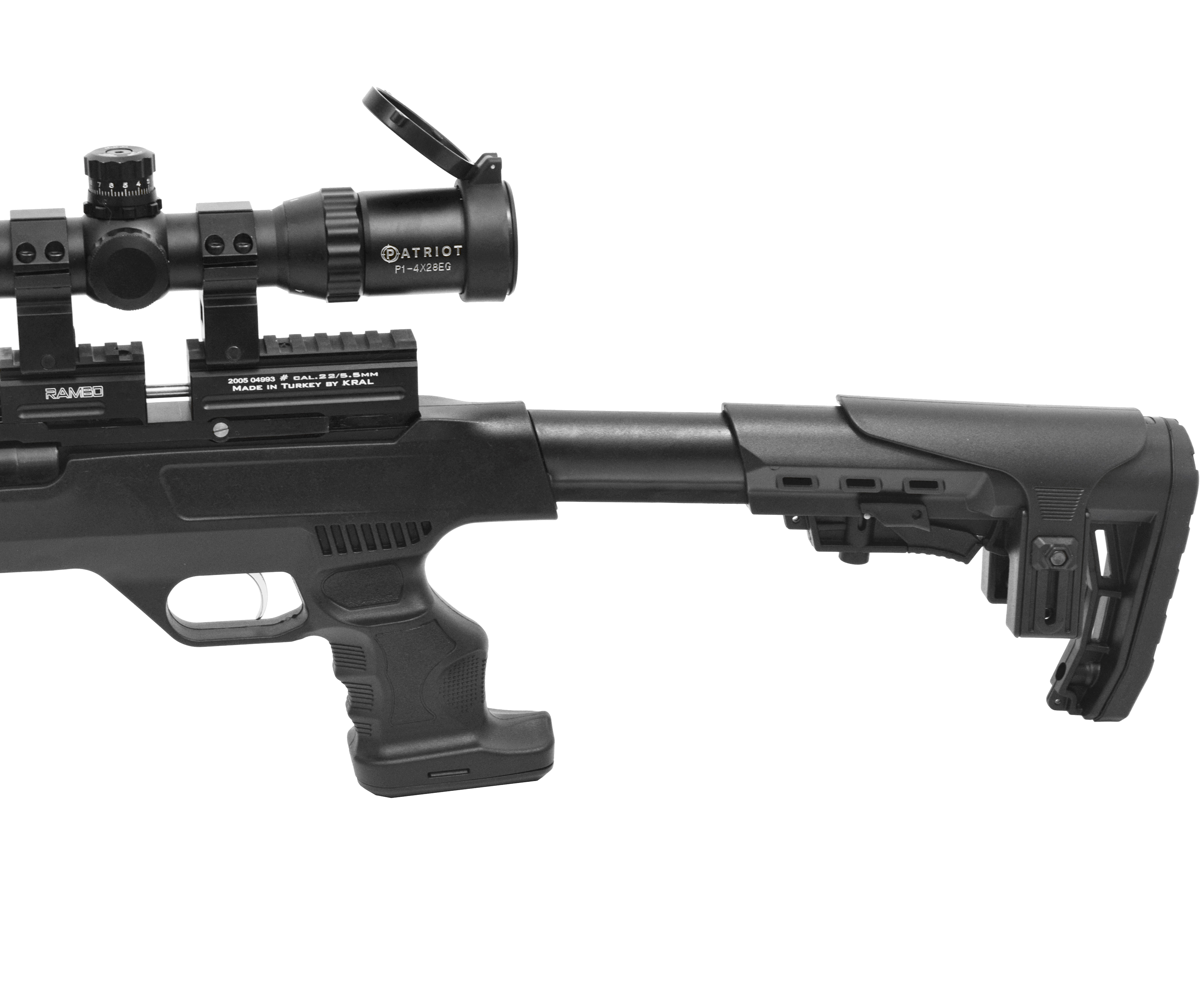 Приклад и ложе винтовки Kral Puncher Rambo выполнены из полимерного материала, стойкого перед любыми воздействиями. Приклад телескопического типа, его настройка осуществляется кнопкой под прикладом. Корпус винтовки металлический, как и основные внутренние элементы. Затыльник приклада прорезиненный, берет на себя часть отдачи при выстреле. Установлена база для прицела в виде планки Вивера.