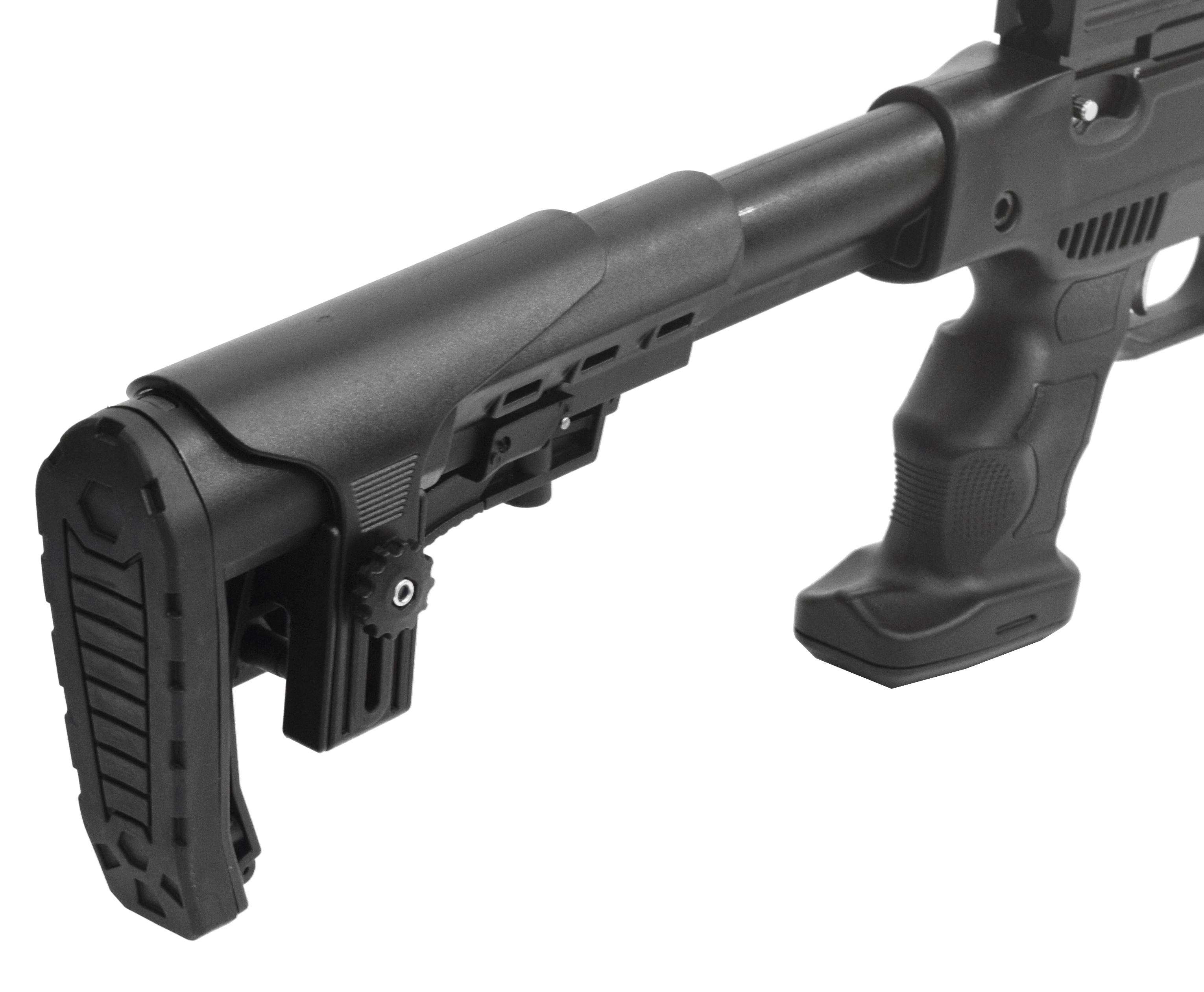 Рукоять пистолетного типа очень удобна для хвата за счет ее формы и рельефной поверхности. Максимальное удобство стрелка при прицеливании обеспечено регулируемым подщечником. Длина винтовки 91,5 см при весе 3,4 кг. Комплектация: два магазина-барабана, штуцер для заправки, а также паспорт.