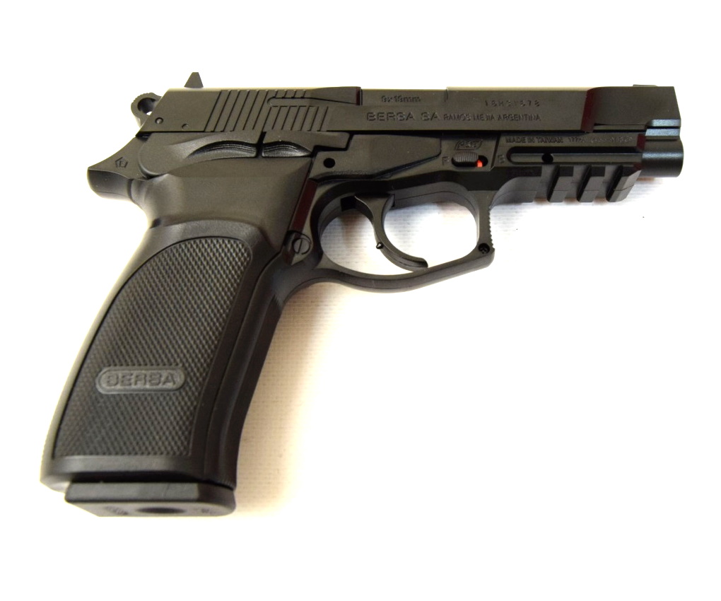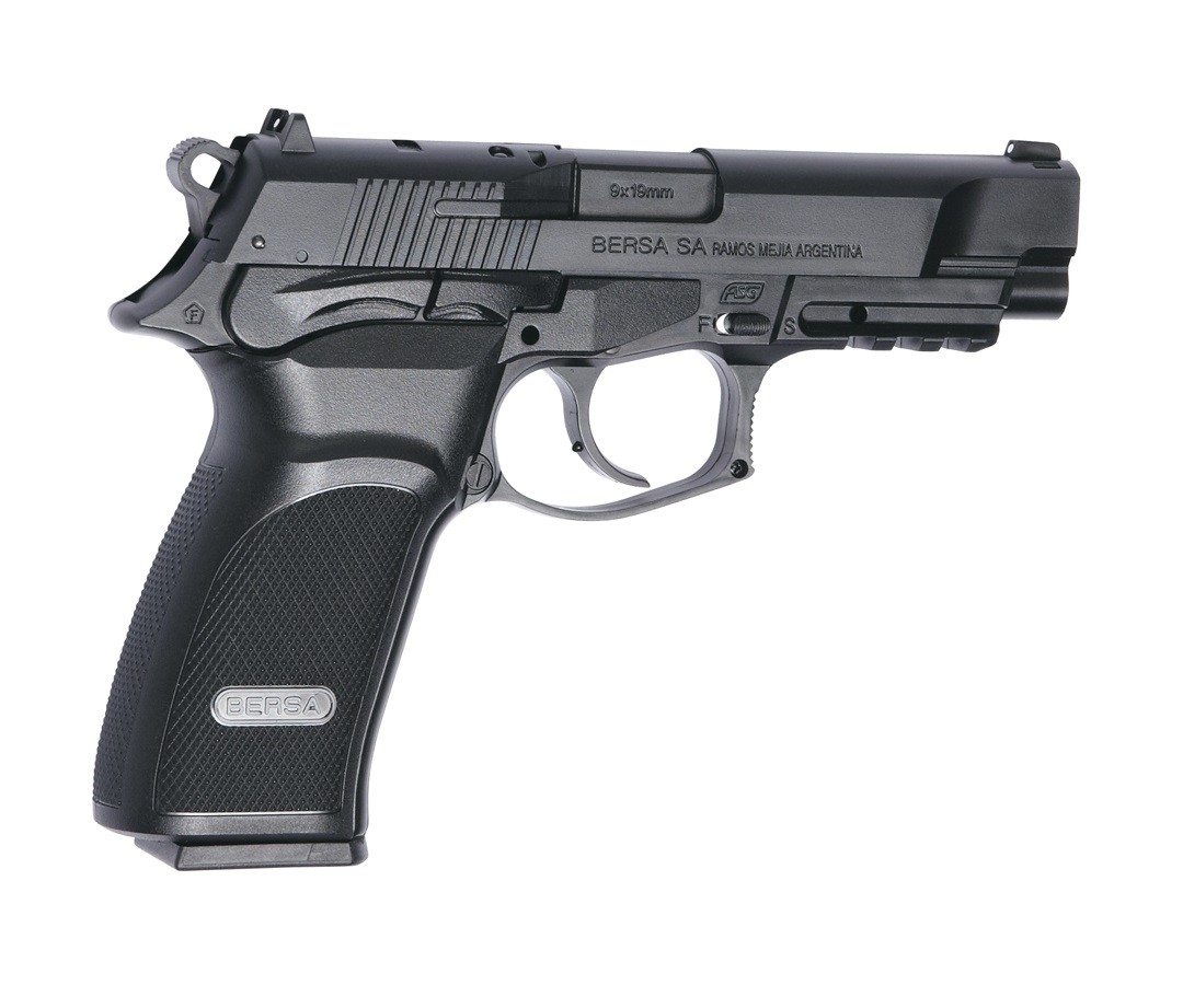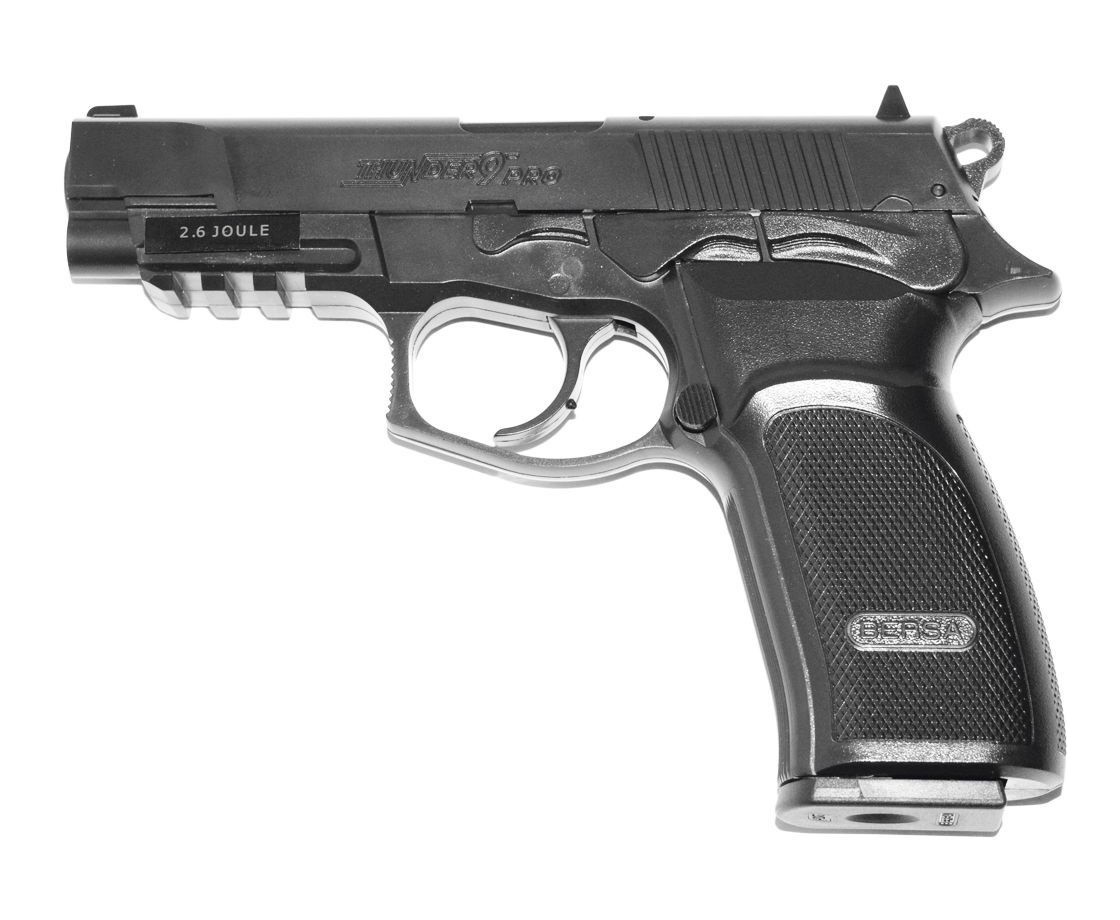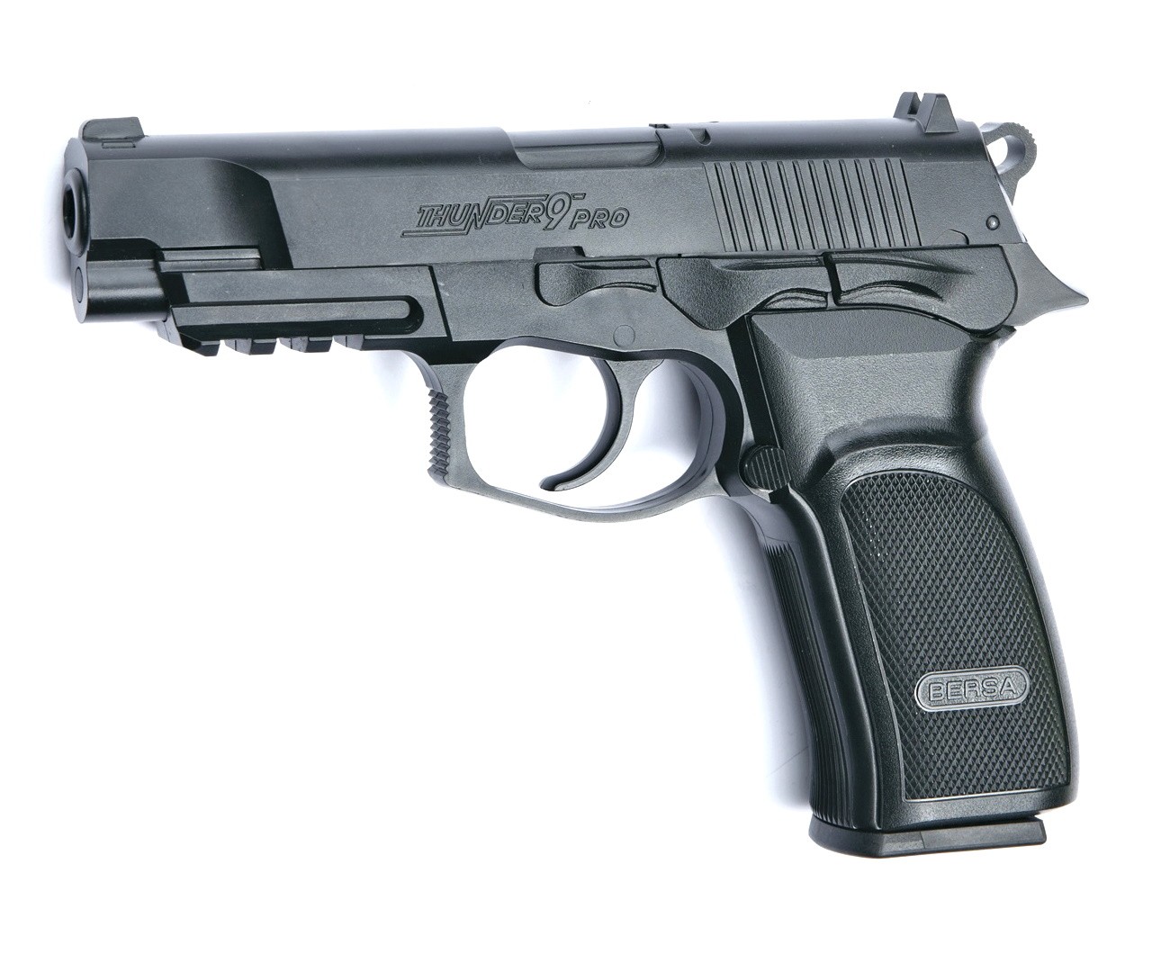 Пневматический пистолет ASG Bersa Thunder 9 Pro- газобаллонный пневматический пистолет, аналог боевого пистолета Bersa Thunder 9 Pro (Аргентина) Начальная скорость боеприпаса составляет 130 м/с, что достаточно много для такого вида пневматики. Все элементы пистолета, включая неподвижный затвор, не функциональны и выполняют лишь декоративную функцию. Также декоративную функцию выполняет курок пистолета - он представляет собой пластиковый неподвижный элемент корпуса. Пистолет изготовлен из пластика. Прицельные приспособления- мушка и целик, на которых нанесены контрастные белые точки для легкого прицеливания в темное время суток или на фоне темных объектов. На нижней передней части пистолета находится направляющая Вивера для установки дополнительных аксессуаров.