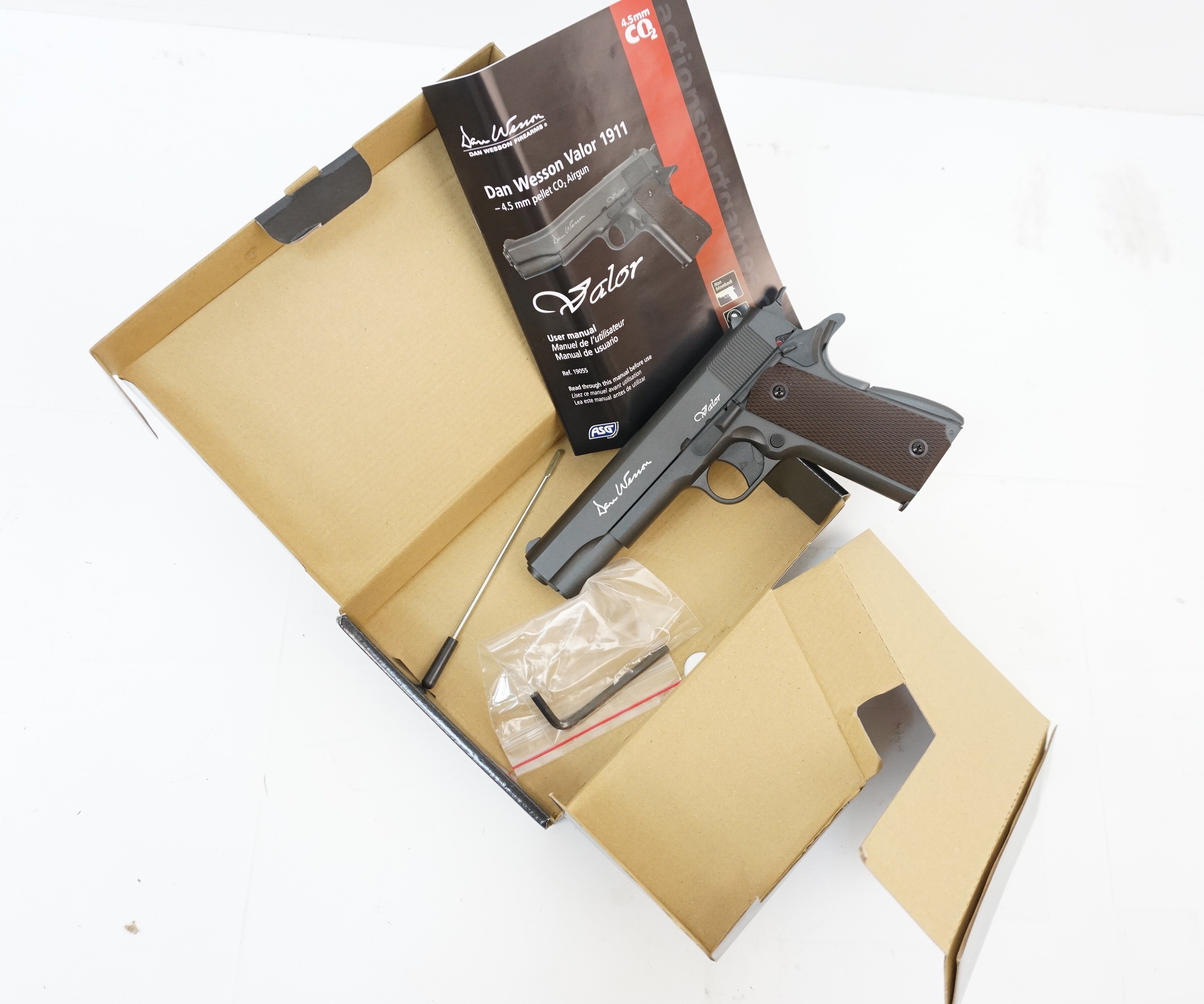 Основной материал изготовления ASG Dan Wesson Valor 1911 – металлический сплав, корпус оружия цельнометаллический, имеет глубокий серый цвет. На рукоятке установлены коричневые накладки из полимерного материала. На корпусе имеется название марки и модели, нанесенное лазерной гравировкой.