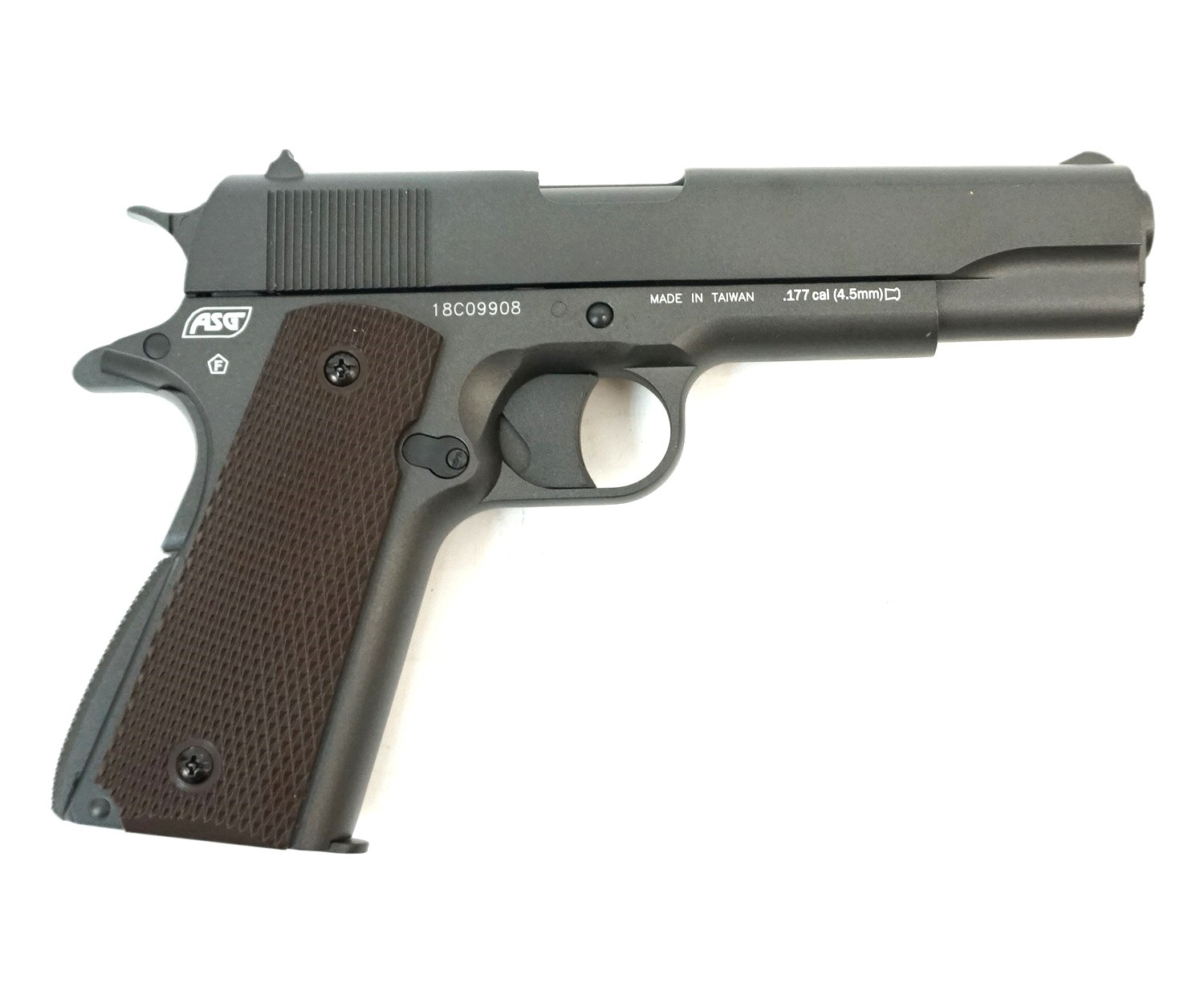 Пневматический пистолет ASG Dan Wesson Valor 1911 – это газобаллонная реплика от ASG, созданная на базе непревзойденного Кольта М 1911 года. Как и каждое изделие этого бренда, пистолет имеет собственный серийный номер. Источником энергии здесь выступает стандартный баллончик с углекислотой на 12 грамм, который располагается в магазине, устанавливаемом в рукоятном отсеке. Пневматическими пулями снаряжается полноразмерный роторный магазин, в его двойной поворотный барабан входит 12 зарядов.