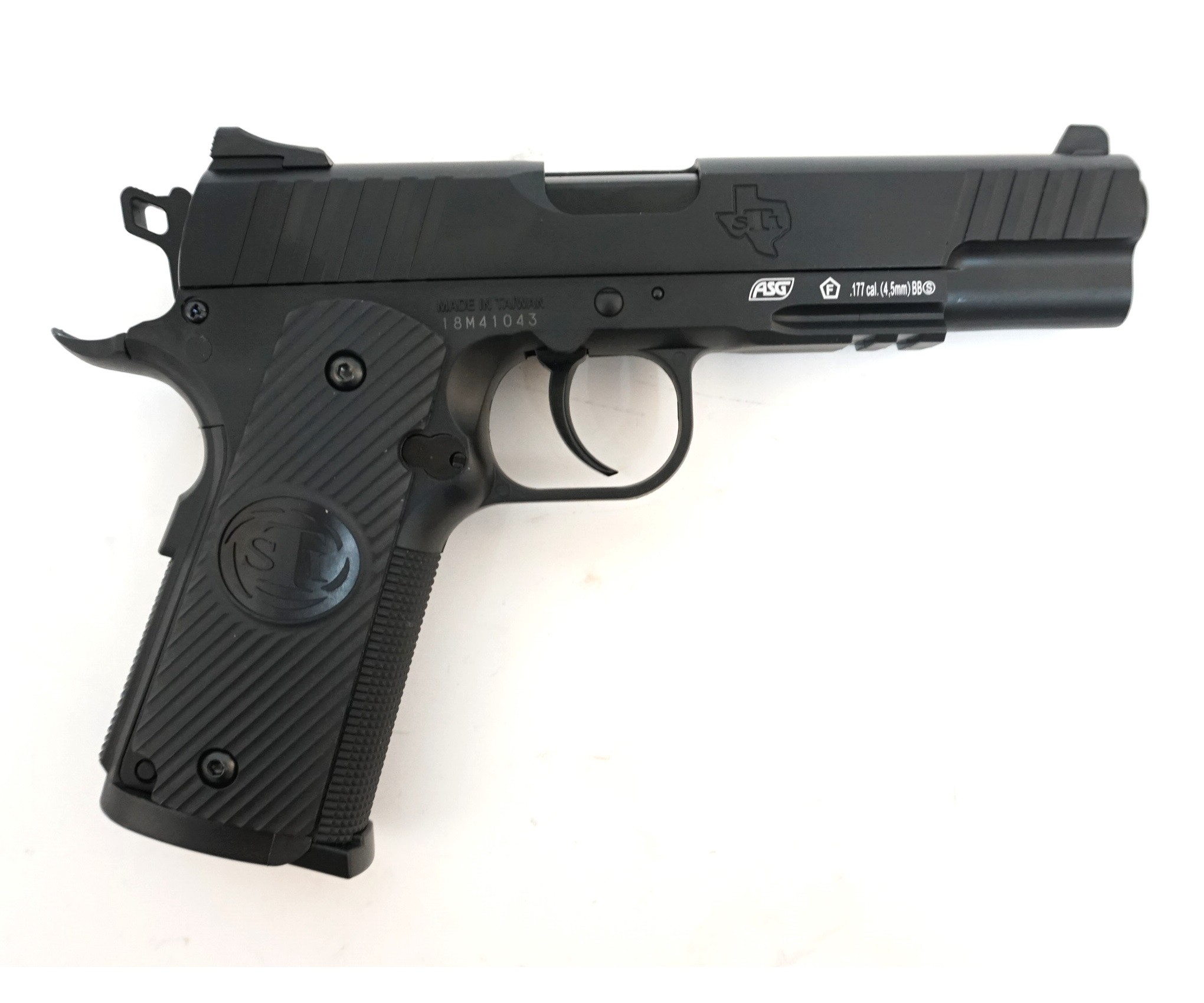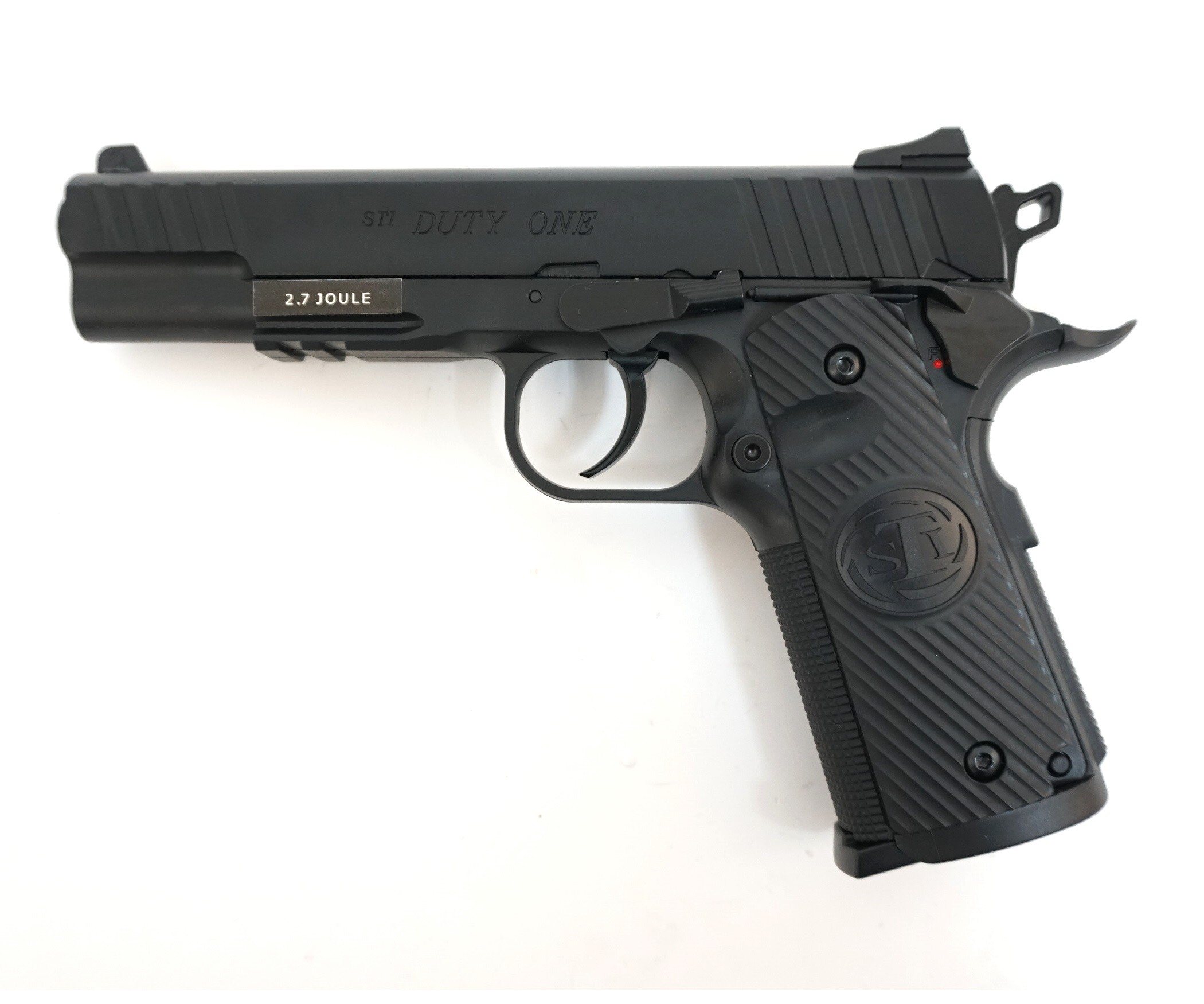 Еще одна фантазия на тему старейшего и известнейшего оружия американской армии - Colt 1911. Пневматический пистолет ASG Sti Duty One - это точная копия пистолета Duty One американского производства STI, выполненная из металла высокого качества. Это превосходный вариант универсального оружия, которое можно использовать как спортивный снаряд или же для обучения охотников и новичков.