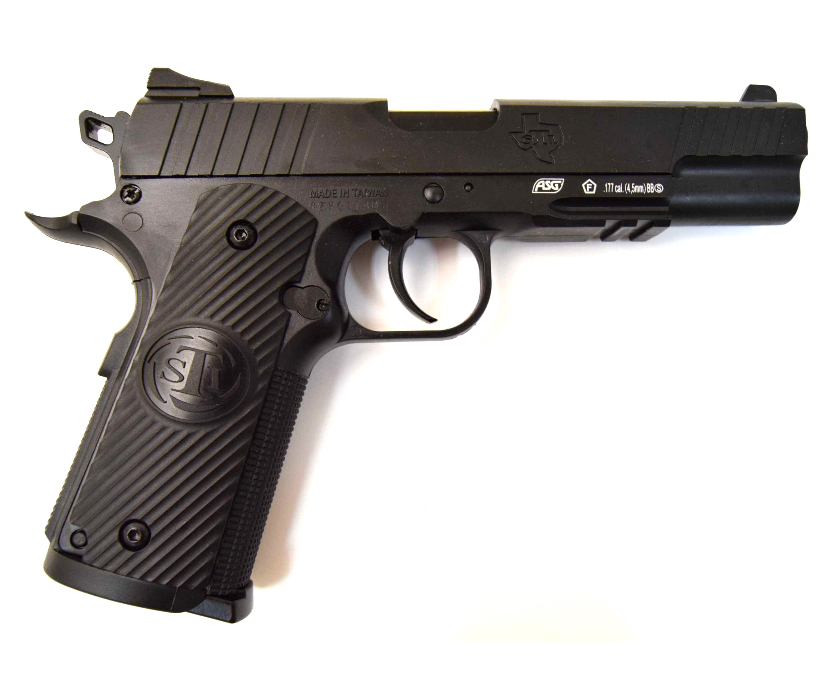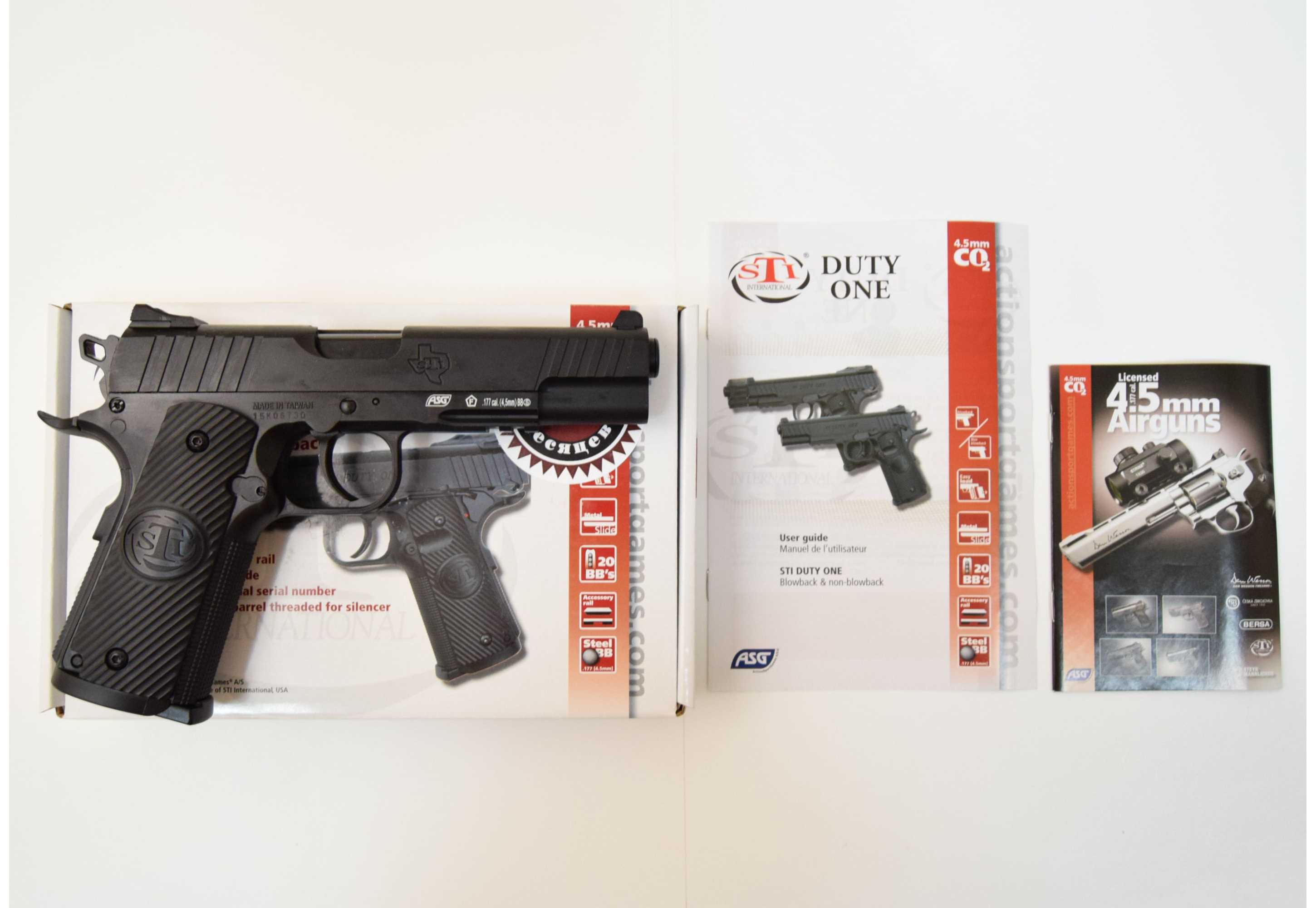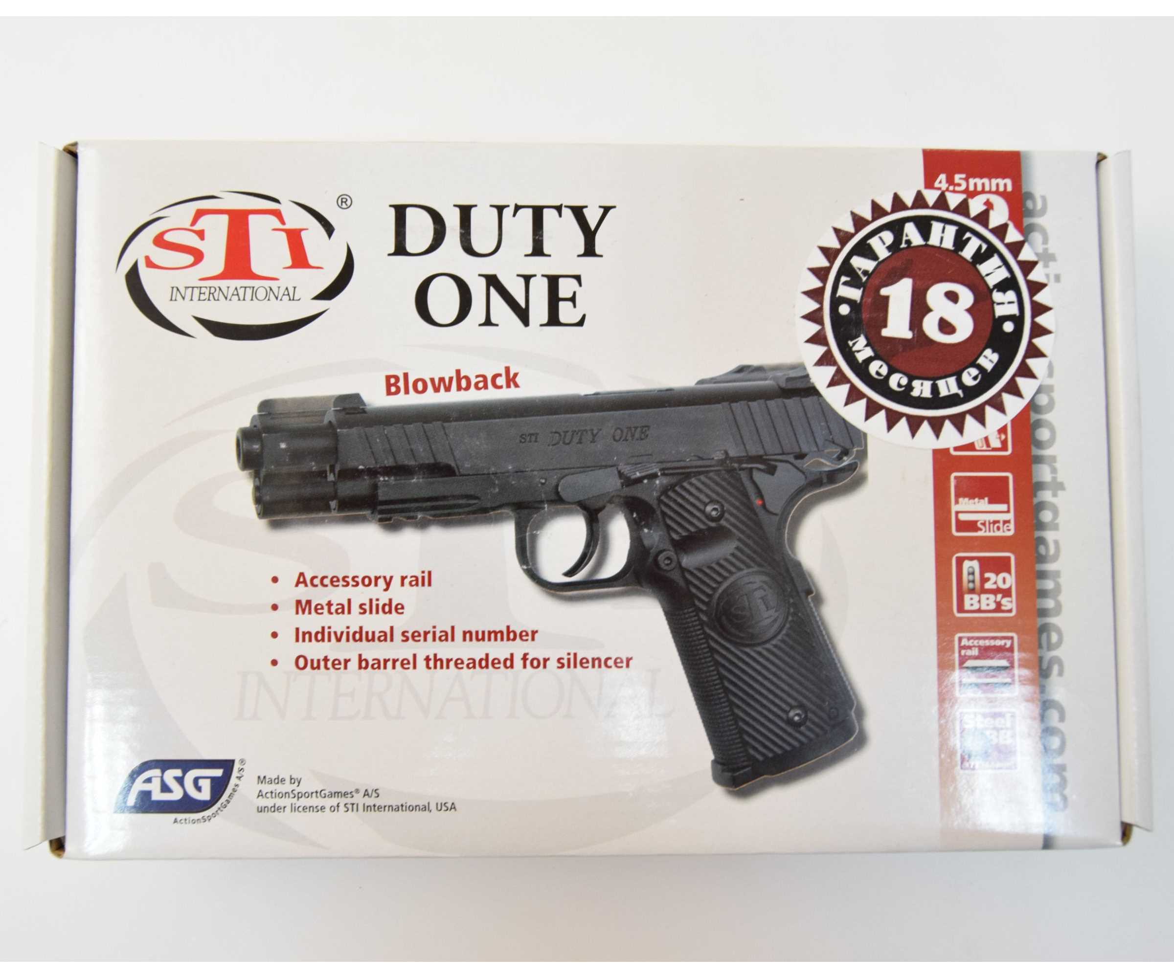 Пневматический пистолет ASG Sti Duty One blowback изготовлен в Тайване для Датской фирмы ASG (Action Sport Game) и является лицензионной газобаллонной копией пистолета Duty One производства STI, который в свою очередь является наследником легендарного Colt 1911. Соответственно, модель Sti Duty One от АСГ является пневматическим аналогом пистолета Кольт 1911.