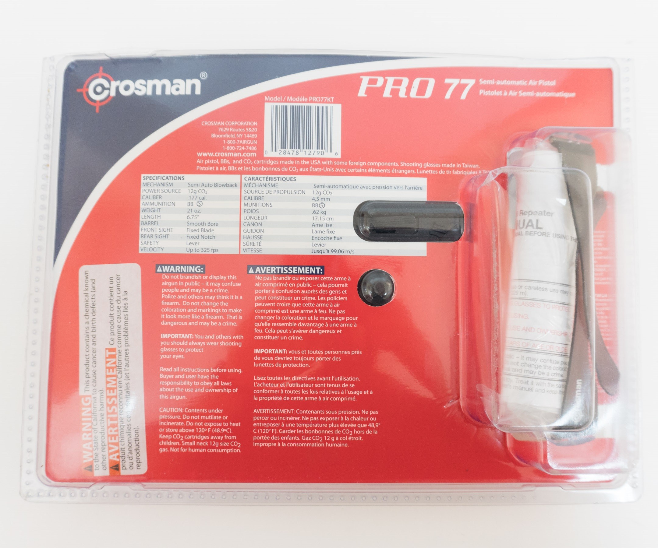 Crosman PRO77 Kit имеет систему «Blow-back», придающую реалистичность при выстреле, а также обеспечивающую плавный спуск.