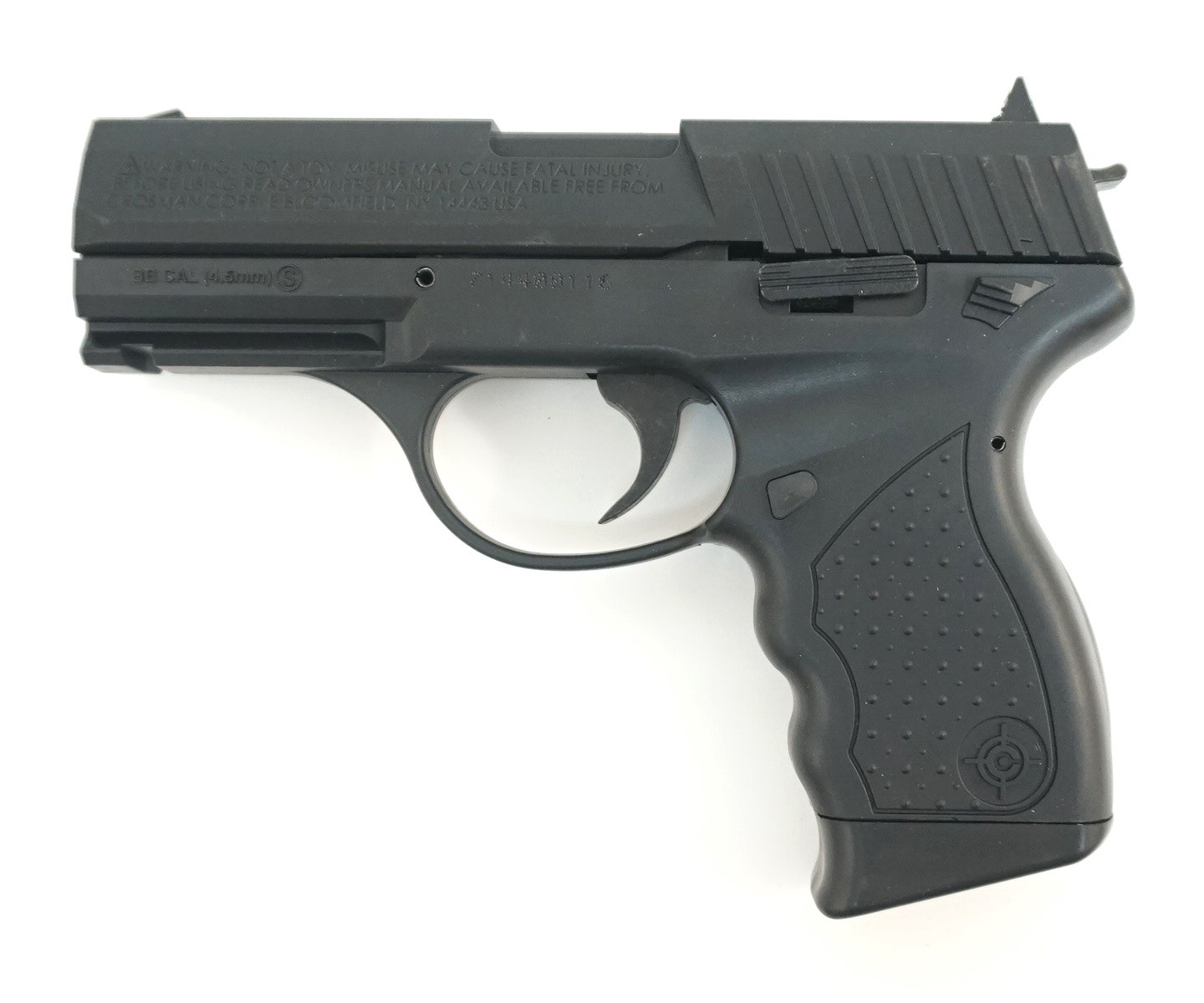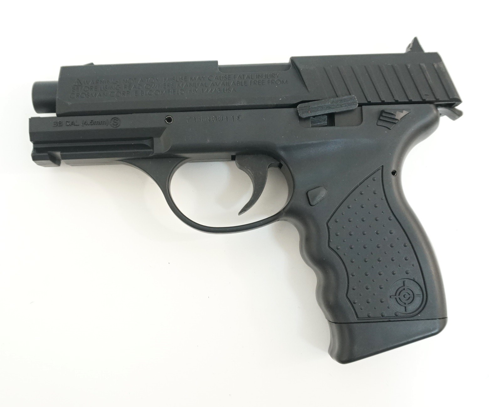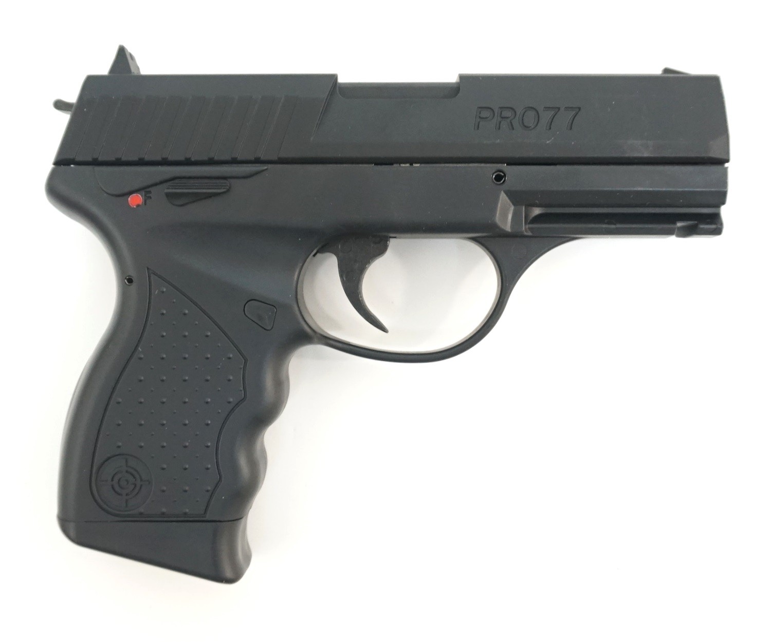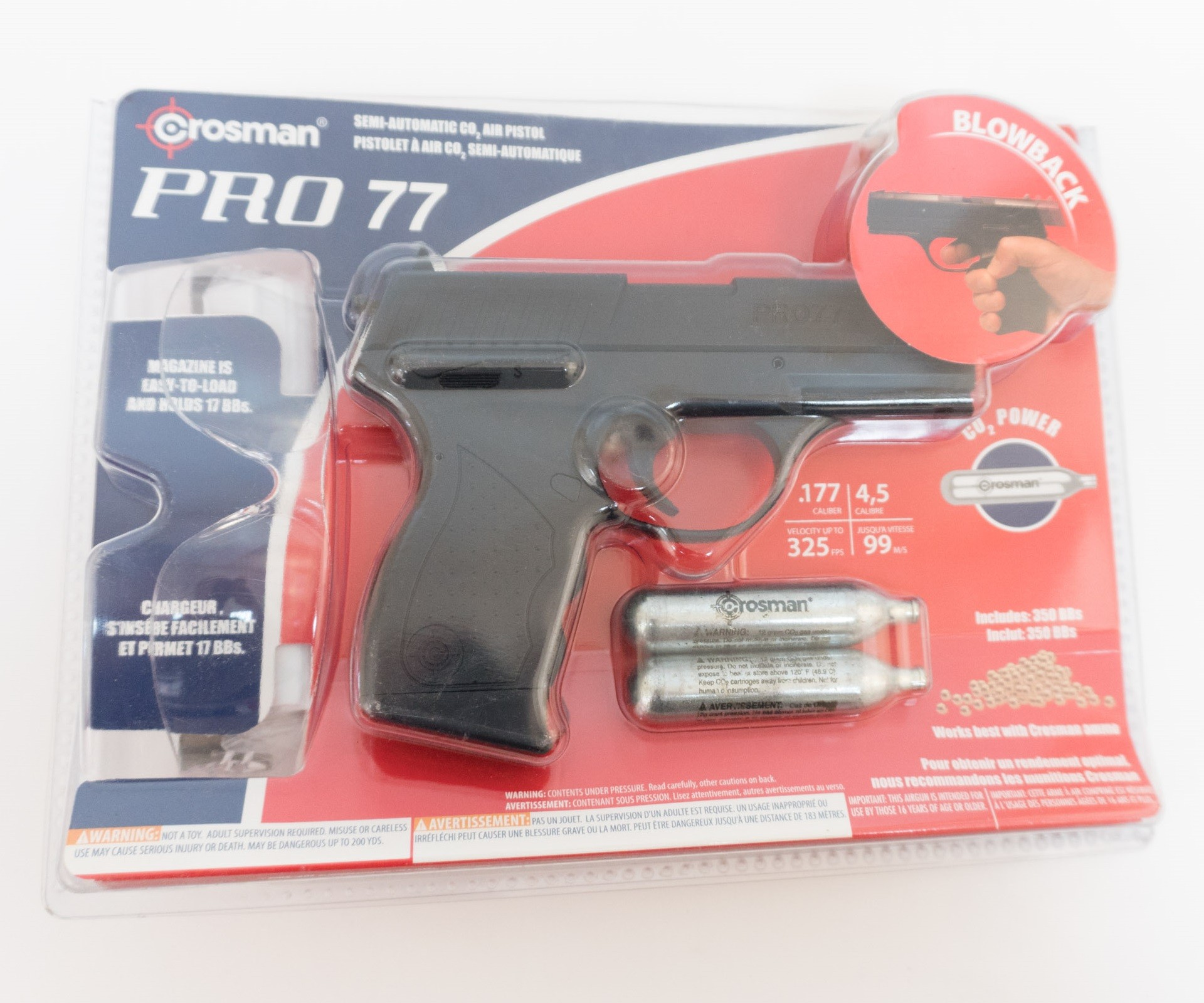 Crosman PRO77CS имеет первоначальную скорость пули 120 м/с. Это модель пистолета выполнена согласно новым стандартам оружия, т.е. ствол, затвор, механизмы и основа сделаны из оружейной стали, а корпус - из ударопрочного пластика. Потому масса пистолета Crosman PRO77 - всего 600 г. Правда, его немного сложно удерживать в одной руке из-за отдачи.