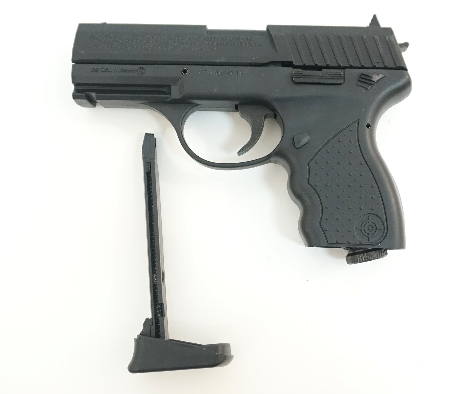 У Crosman PRO77CS стальной гладкий ствол, потому прицельная дальность стрельбы сравнительно невелика - 8-10 м, впрочем, её вполне хватает для стрельбы по банкам. Магазин, расположенный в рукоятке, вмещает 17 круглых пуль, размер которых 4,5 мм. Установка и замена магазина максимально просты, это облегчает обращение с пистолетом для новичков.