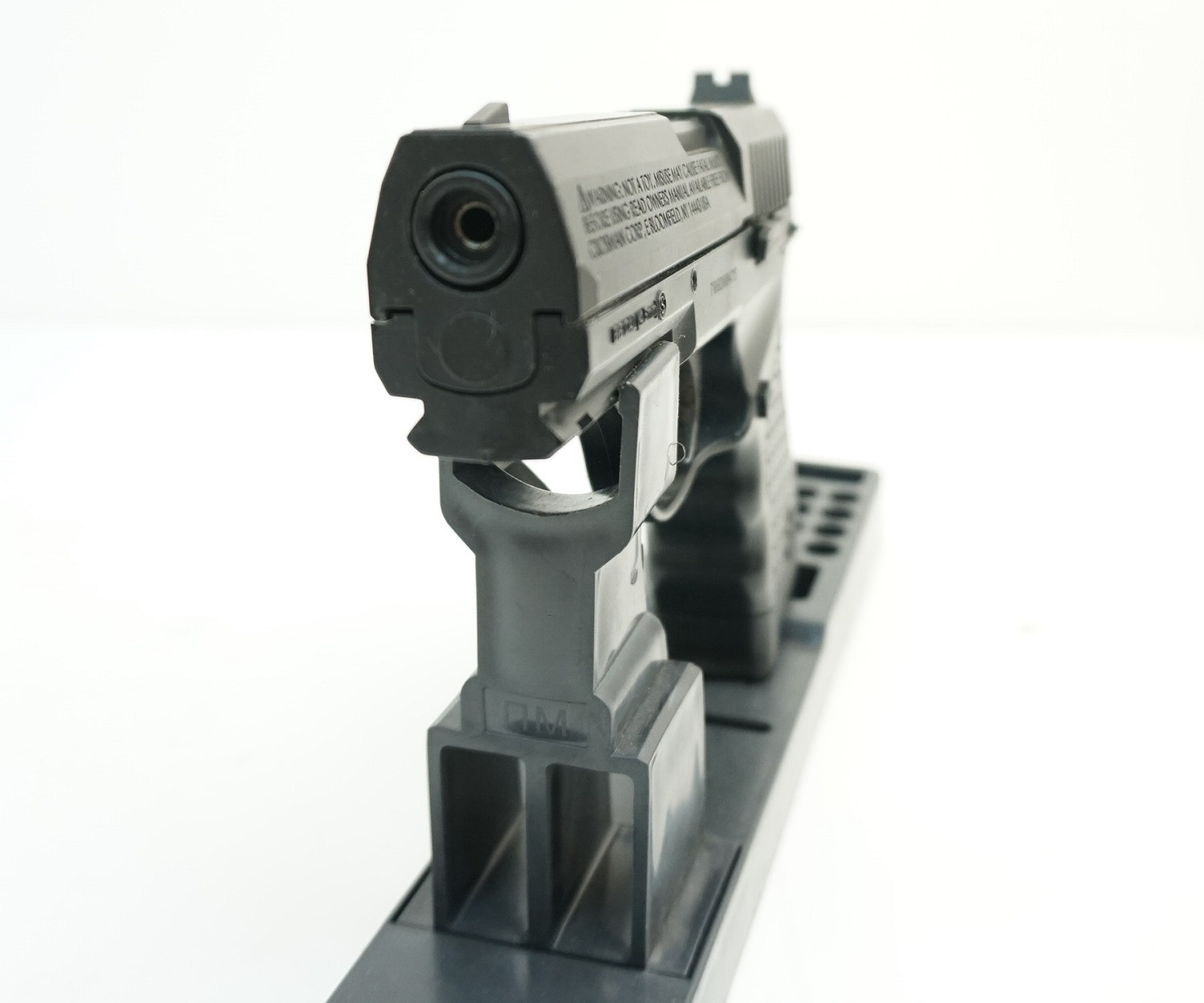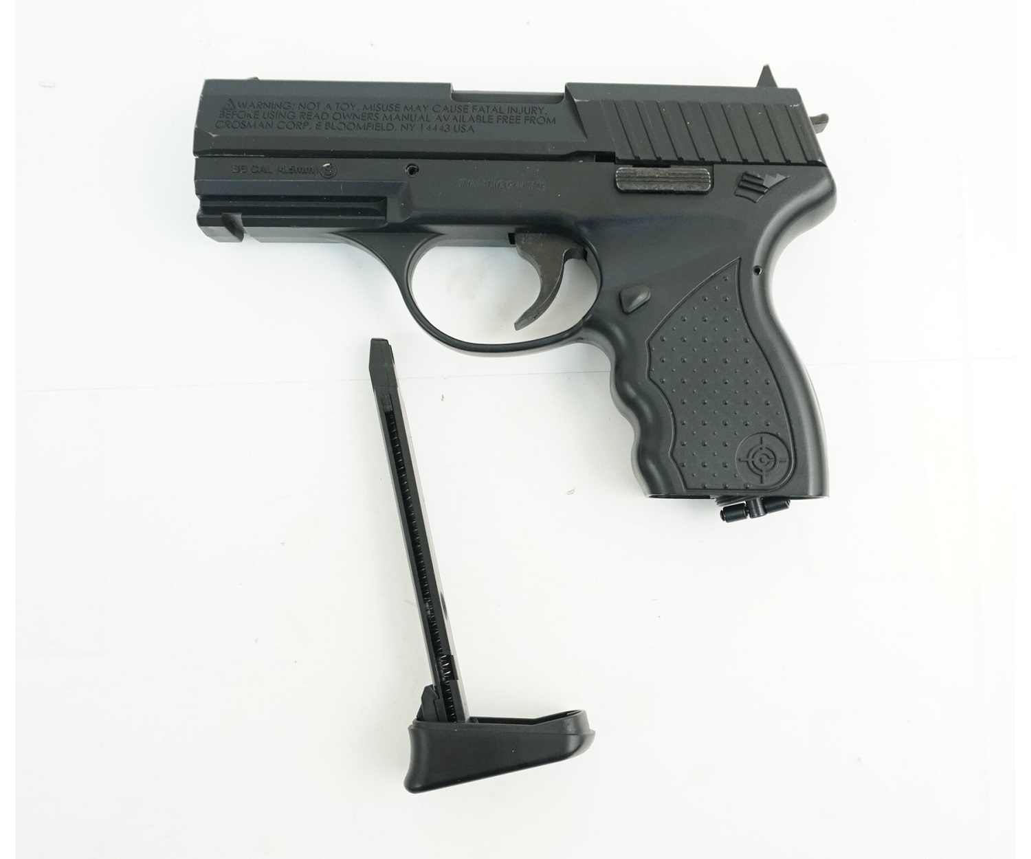 У Crosman PRO77CS стальной гладкий ствол, потому прицельная дальность стрельбы сравнительно невелика - 8-10 метров, впрочем, её вполне хватает для стрельбы по банкам. Магазин, расположенный в рукоятке, вмещает 17 круглых пуль, размер которых 4,5 мм. Установка и замена магазина максимально просты, это облегчает обращение с пистолетом для новичков.