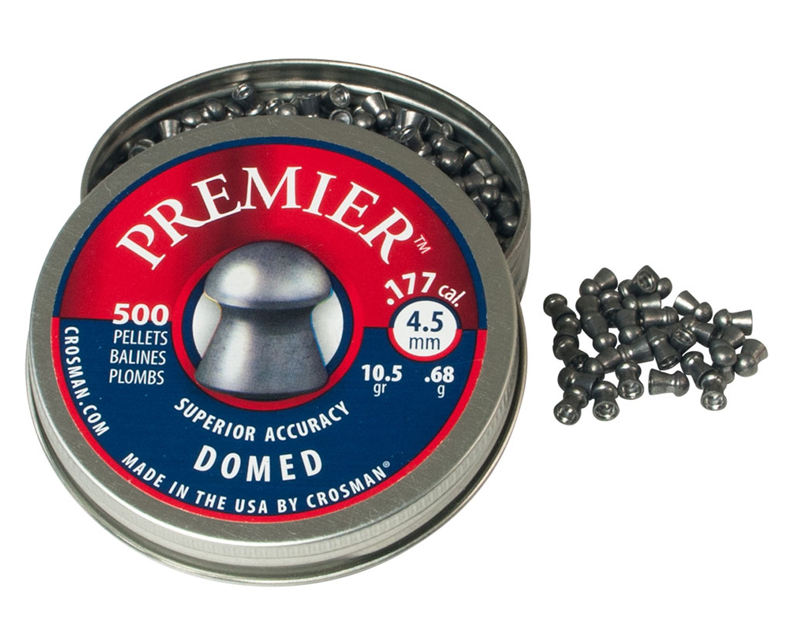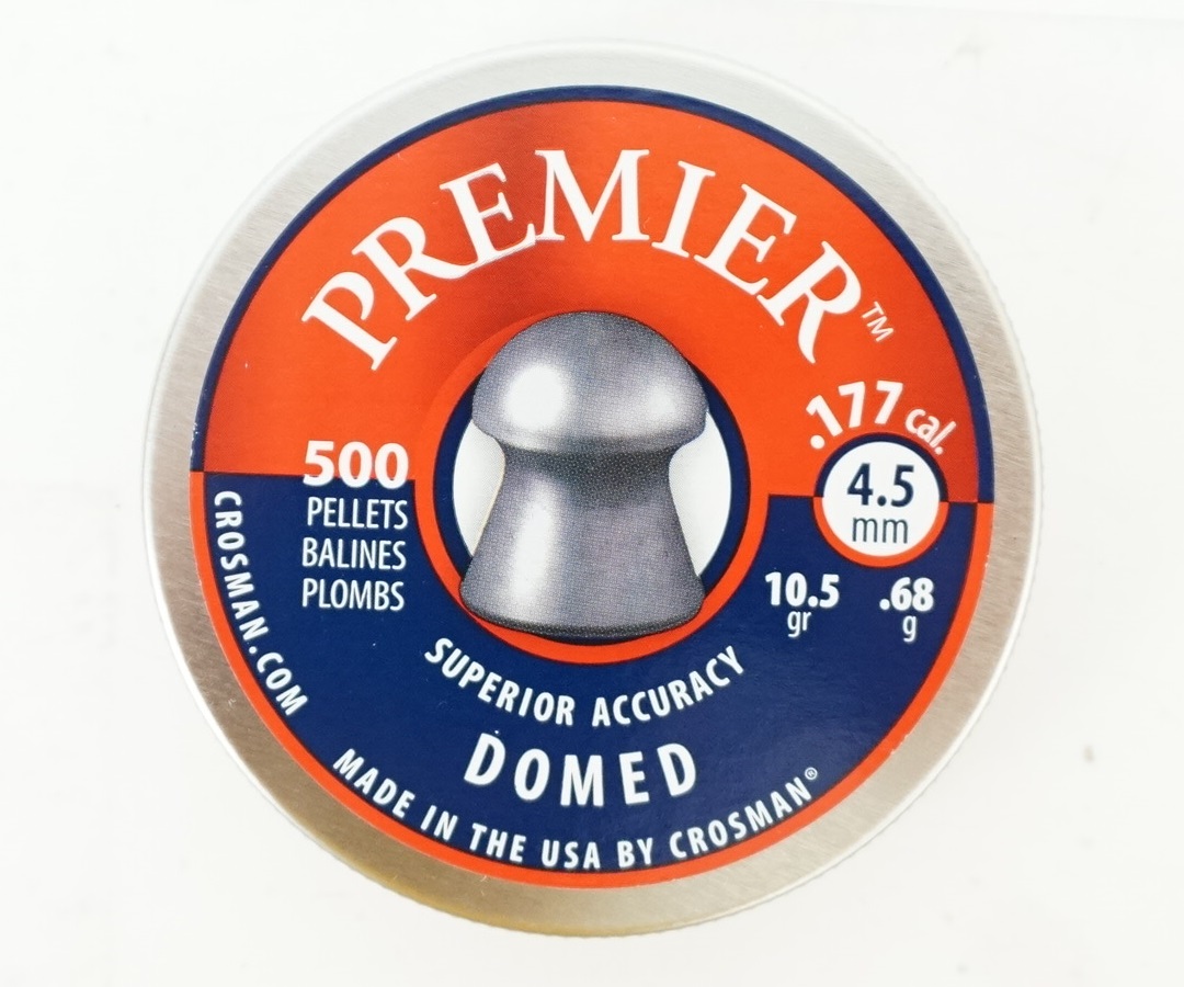 Пули Crosman Premier Domed с округлой головной частью обладают низким аэродинамическим сопротивлением. Лучше всего эти пули подходят для стрельбы на дальние дистанции, и следовательно для охоты. Изготовлены из свинца с добавлением сурьмы, имеют немного завышенный размер. В упаковке 500 штук, средний вес 0,68 грамм