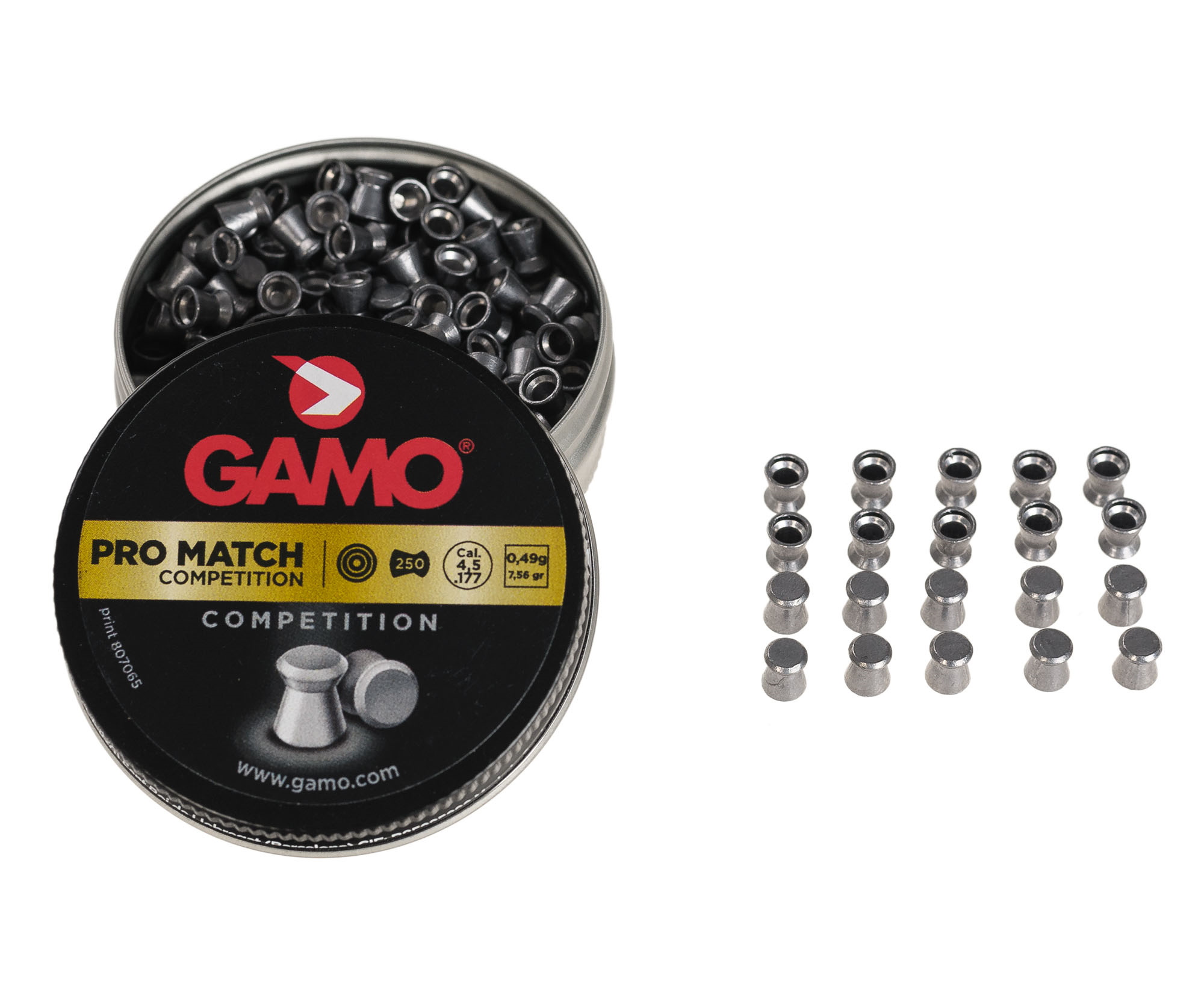Gamo Pro Match предназначены для развлекательной и спортивной стрельбы по мишеням. Количество пуль в банке - 250 штук средним весом 0,49 грамм. Головная часть имеет плоскую поверхность, благодаря этому пуля выбивает ровный круглый след в мишени из бумаги, что значительно упрощает подсчет очков.