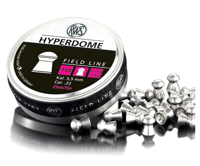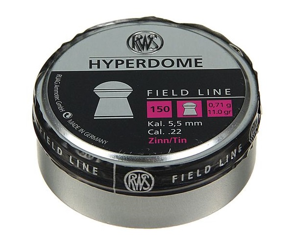 Пули RWS Hyperdome для пневматики калибра 5,5 мм — высокоточные облегченные пули с полусферической головной частью. Состоят из высокотехнологичного легированного олова и демонстрируют блистательный высокоскоростной финиш при стрельбе. Данная пуля идеально подходит для полевой стрельбы (Field Target), также возможно применение на охоте. Пули в количестве 150 штук средним весом 0,71 грамм.