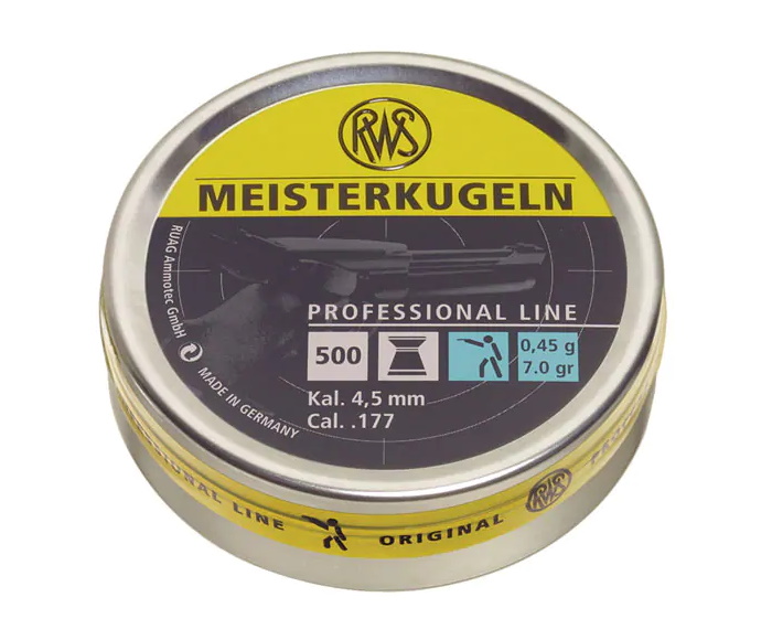 Пули RWS Meisterkugeln Pistol калибра 4,5 мм - это высокоточные пули для стрельбы из пневматического пистолета, которые используют спортсмены-стрелки. Применение композитных материалов, а также оптимизация обработки поверхности пуль данного класса является гарантией сохранения на продолжительное время блеска пули. Пули RWS Meisterkugeln отлично подходят для спортивной имитации охоты, а также для стрельбы по мишеням, в том числе и по падающим мишеням. Пули весят 0,45 грамм, в упаковке 500 штук.