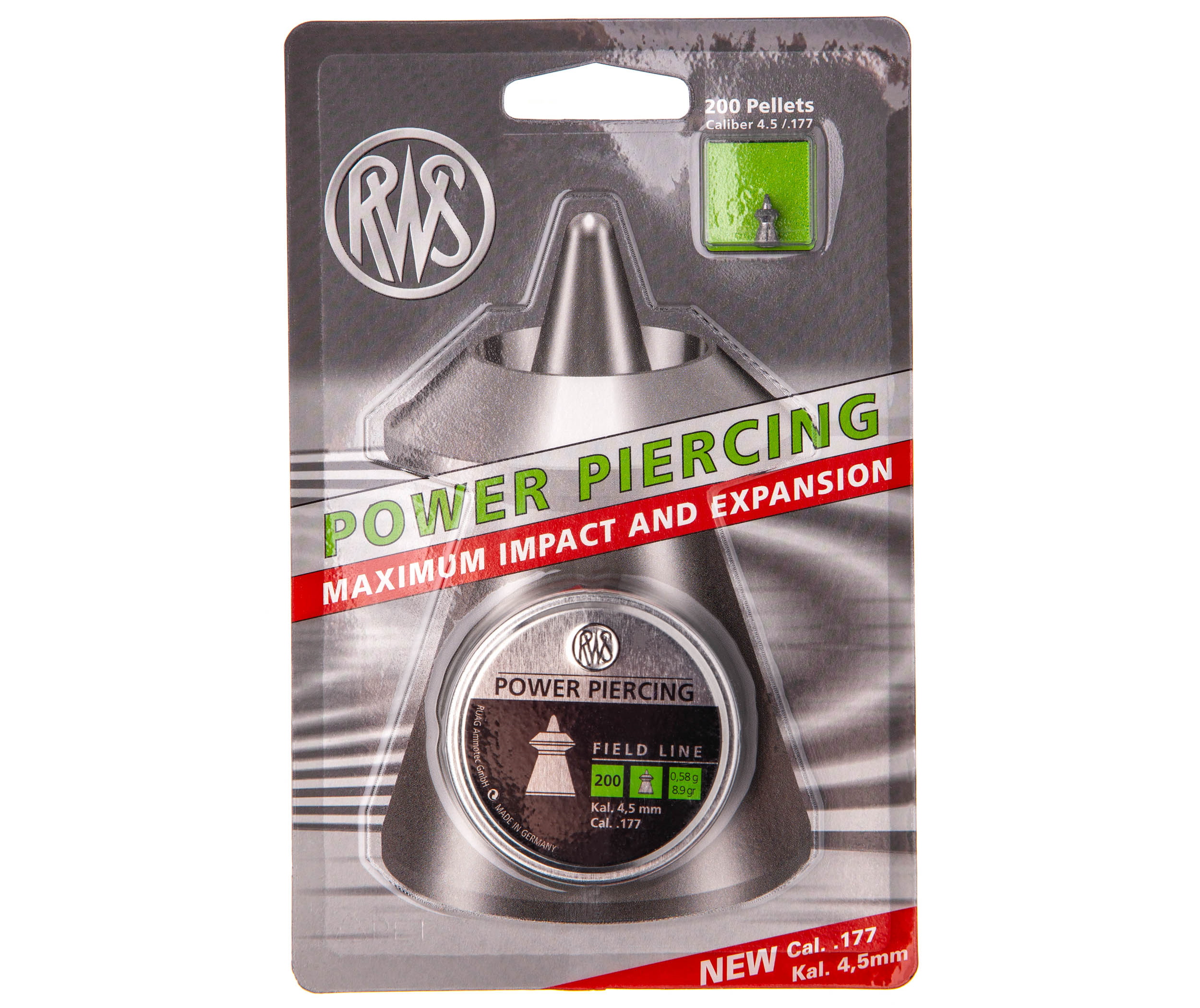 Пули RWS Power Piercing калибра 4,5 мм - экспансивные, с проникающим сердечником, для пневматических винтовок и пистолетов. Средний вес 0,58 грамм. Среди других пуль ее выделяет особая форма, благодаря которой пуля наилучшим образом подходит как для охоты на животных-вредителей, так и для спортивной стрельбы по силуэтным мишеням. В баночке 200 штук.