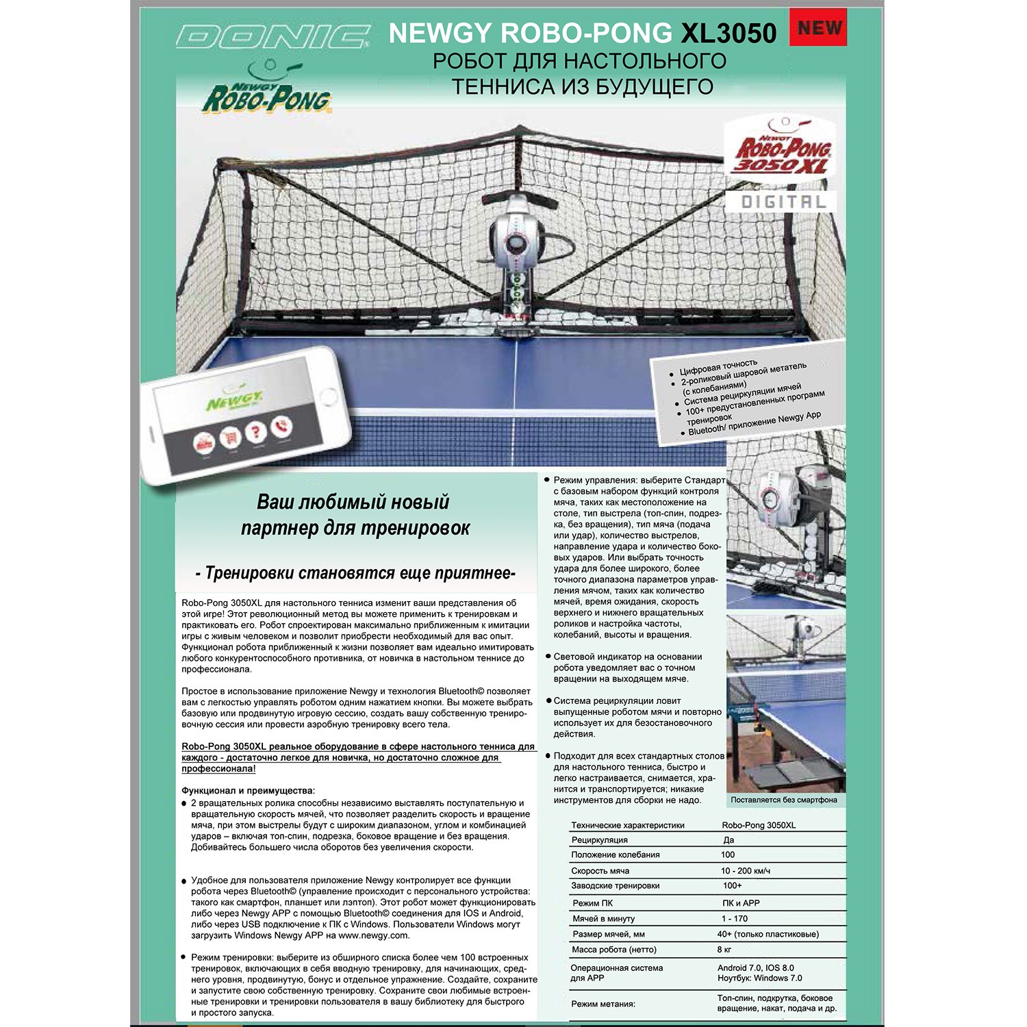 Робот настольный DONIC NEWGY ROBO-PONG 3050 XL - это ваш новый любимый партнер для тренировок. Robo-Pong 3050 XL для настольного тенниса изменит ваши представления об этой игре. Этот революционный метод вы можете применить к тренировкам и практиковать его. Робот спроектирован максимально приближенным к имитации игры с живым человеком и позволит приобрести необходимый для вас опыт. Функционал робота, приближенный к жизни, позволяет вам идеально имитировать любого конкурентноспособного противника, от новичка в настольном теннисе до профессионала. Простое в использовании приложение Newgy и технология Bleutooth© позволяет вам с легкостью управлять роботом одним нажатием кнопки. Вы можете выбрать базовую или продвинутую игровую сессию, создать вашу собственную тренировочную сессию, или провести аэробную тренировку своего тела. Robo-Pong 3050 XL реальное оборудование в сфере настольного тенниса для каждого - достаточно легкое для новичка, и при этом достаточно сложное для профессионала. Функционал и преимущества модели: 2 вращательных ролика способны независимо выставлять поступательную и вращательную скорость мячей, что позволяет разделить скорость и вращение мяча, при этом выстрелы будут с широким диапазоном, углом и комбинацией ударов - включая топ-спин, подрезку, боковое вращение и без вращения. Добивайтесь большего числа оборотов без увеличения скорости. Удобное для пользователя приложение Newgy контролирует все функции робота через Bluetooth© (управление происходит с персонального устройства: такого как смартфон, планшет или лэптоп). Этот робот может функционировать либо через Newgy APP с помощью Bluetooth© соединения для IOS и Android, либо через USB подключение к ПК с Windows. Пользователи Windows могут загрузить Windows Newgy APP на сайте www.newgy.com. Режим тренировки: выберите из обширного списка более чем 100 встроенных тренировок, включающих в себя вводную тренировку, для начинающих, среднего уровня, продвинутую, бонус и отдельное упражнение. Создайте, сохраните и запустите свою собственную тренировку. Сохраните свои любимые встроенные тренировки и тренировки пользователя в вашу библиотеку для быстрого и простого запуска. Режим управления: выберите Стандарт с базовым набором функций контроля мяча, таких как местоположение на столе, тип выстрела (топ - спин, подрезка, без вращения), тип мяча (подача или удар), количество выстрелов, направление удара и количество боковых ударов. Или выбрать точность удара для более широкого, более точного диапазона параметров управления мячом, таких как количество мячей, время ожидания, скорость верхнего и нижнего вращательных роликов и настройка частоты, колебаний, высоты и вращения. Световой индикатор на основании робота уведомляет вас о точном вращении на выходящем мяче. Система рециркуляции ловит выпущенные роботом и отбитые игроком мячи, и повторно использует их для безостановочной тренировки. Робот подходит для всех стандартных столов для настольного тенниса, быстро и легко настраивается, снимается, хранится и транспортируется; для сборки не требуются инструменты. Размер мячей, мм 40+ (только пластиковые) Рециркуляция мячей есть Положение колебания 100 Скорость мяча 10 - 200 км/ч Заводские тренировки 100+ Мячей в минуту 1 - 170 Режим ПК ПК или APP Операционная система для APP Android 7.0, IOS 8.0 Ноутбук: Windows 7.0 Режим метания топ-спин, подкрутка, боковое вращени