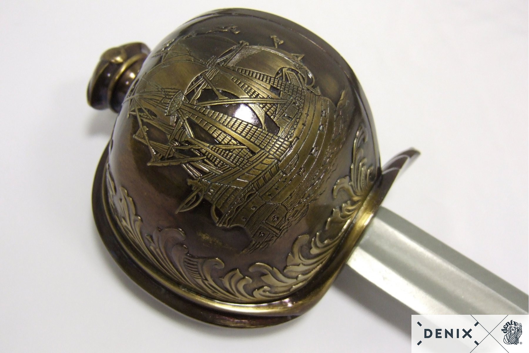 Клинок имеет своеобразную конфигурацию, он небольшой длины и расширен к концу. На поверхности клинка изображен морской дракон. Эфес имеет округлую форму гарды (ее иногда называют корзиной), она защищает руку владельца от ударов противника. Поверхность гарды украшена изображением морского корабля под парусами. Длина сабли 81,5 см, вес 1,51 кг.