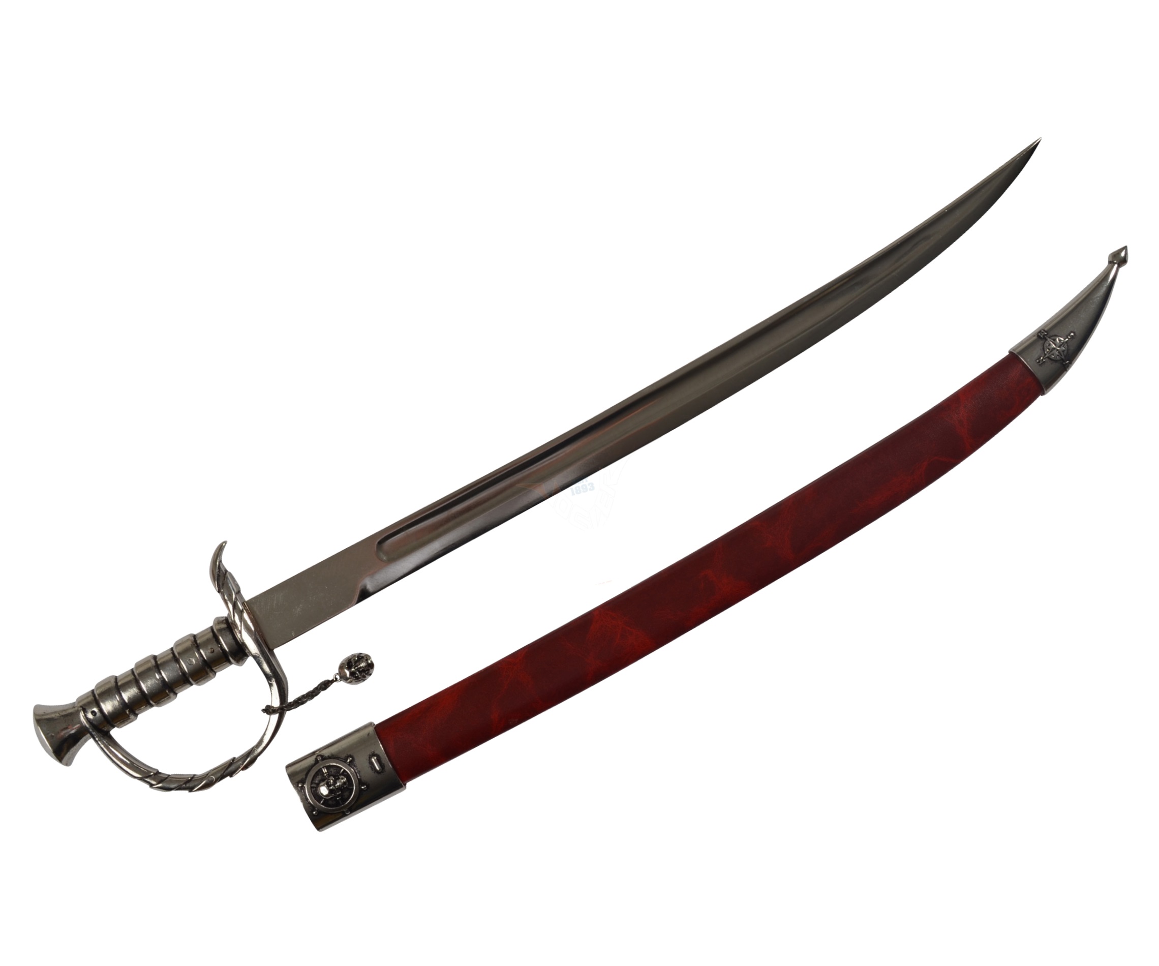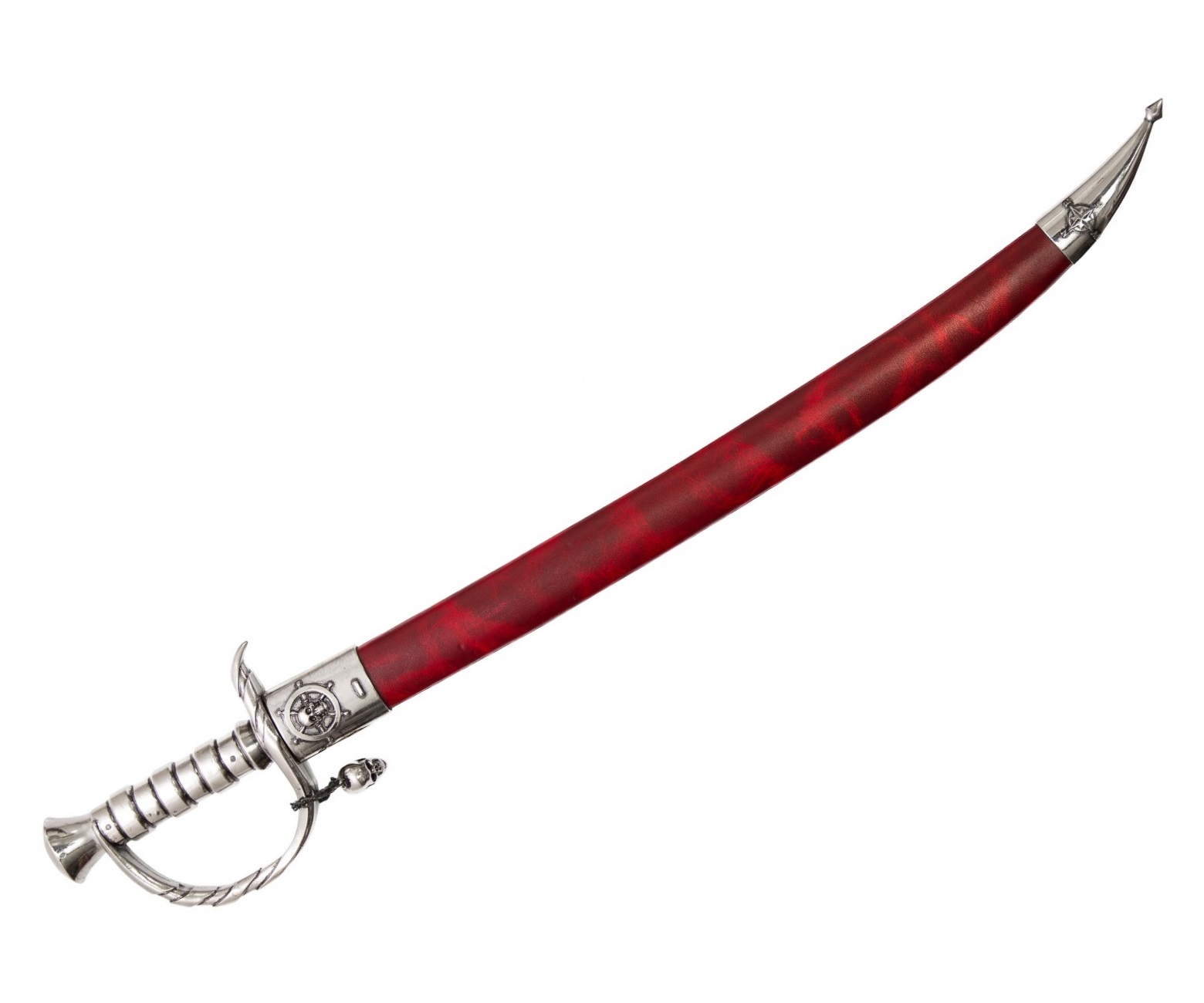 Рукоятка выполнена в технике, напоминающей спиралевидную оплетку, что позволяло надежно удерживать ее в бою. Эфес украшен брелоком на цепочке с изображением черепа. Изделие комплектуется ножнами бордового цвета, поверхность ножен имитирует фактуру натуральной кожи. Цвет сабли – серебристый. Ножны также украшены изображением черепа. Длина сабли 77 см, вес 1,41 кг. Упаковка – картонная коробка.