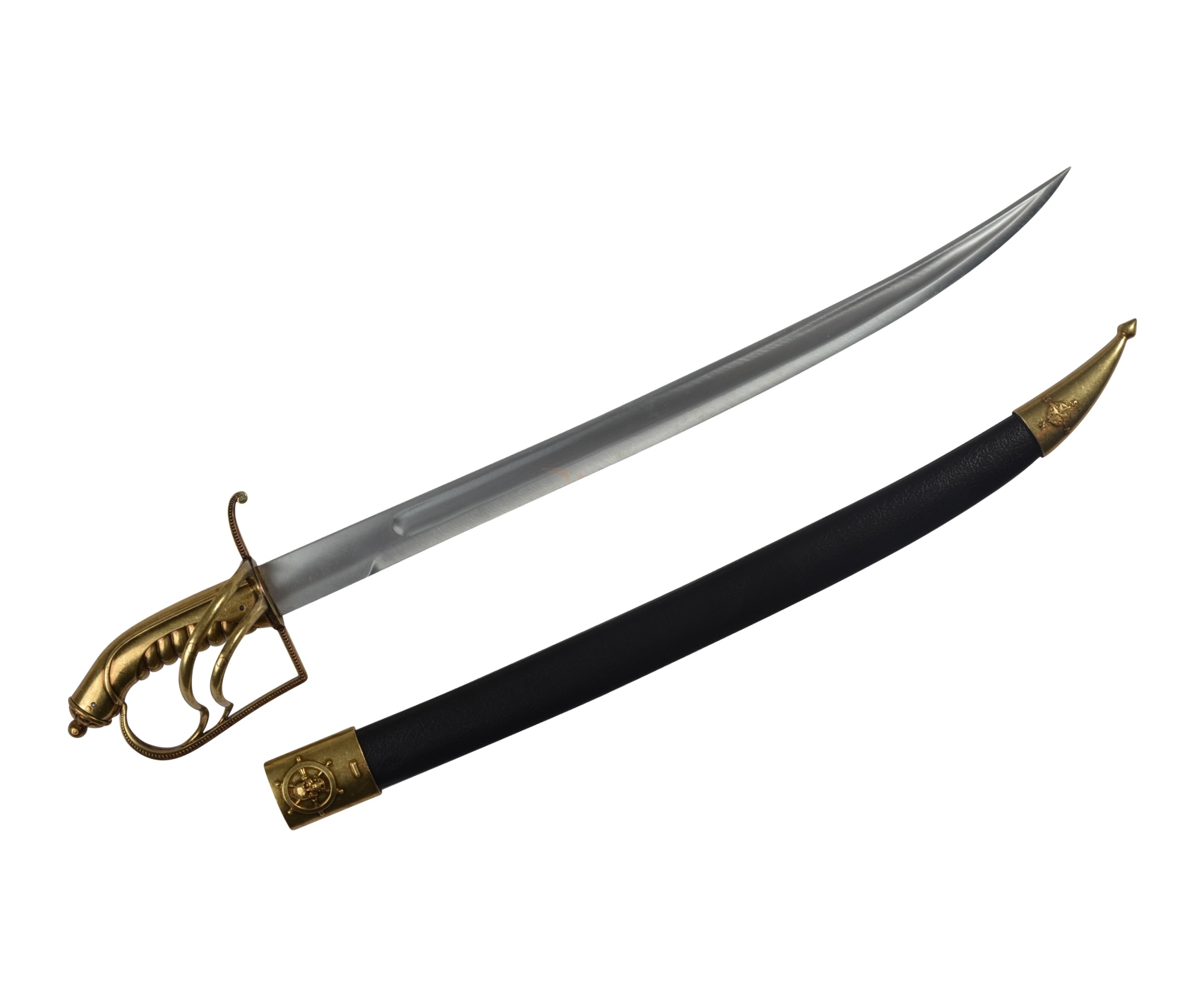 Особого внимания заслуживает форма эфеса и гарды сабли, а также ее фигурная рукоятка. Изделие комплектуется ножнами черного цвета, изготовленными из пластика «под кожу», с наконечником, на котором имеется гравировка компаса. В верхней части ножен выполнена инкрустация символа пиратов – черепа с костями.