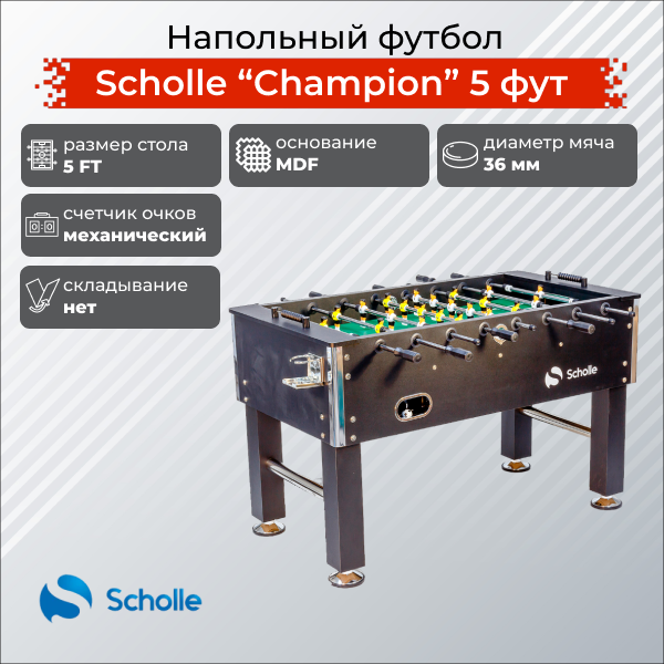 Футбольный стол SCHOLLE “CHAMPION” идеально подойдет для игры дома или в офисе. Корпус, борт стола и ножки выполнены из МДФ, штанги - из усиленной хромированной стали. Фигурки игроков сделаны из высокопрочного ABS-пластика, устойчивого к механическим повреждениям. На поле 22 фигурки игроков. Размер стола - 5 FT, длина – 164.6 см. Размер игрового поля 117х68 см. Регуляторы высоты на опорах позволяют выровнять поверхность стола и устранить качание при игре. Стол оснащен электронным счетчиком голов.Данная модель предназначена для продвинутых игроков. В комплекте: инструкция по сборке, мячи.