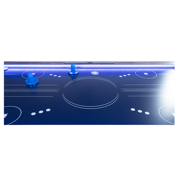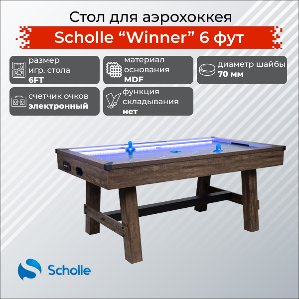 Аэрохоккей Scholle WINNER оснащен светодиодной подсветкой с музыкальным сопровоздением. Также светодиодами оснащены две биты работающие на двух батарейках типа ААА ( не входит в комплект) и одна из трех шайб. Данная модель предназначена для использования в условиях дома и офиса, подойдет как для начинающих, так и продвинутых пользователей. Корпус, ножки и игровое поле выполнены из МДФ. Компенсаторы неровности пола позволяют выровнять стол даже при установке на неровную поверхность и устранить качение. Размер стола 6 FT, длина – 183 см. Стол оснащен электронным счетчиком очков. Мощный вентилятор предотвращает трение шайбы об игровое поле, обеспечивая хорошую скорость и динамичность игры.