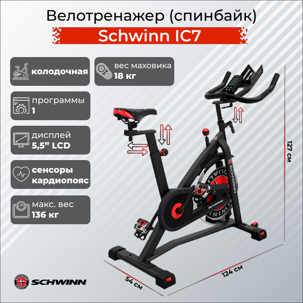 Спинбайк Schwinn IC7 – домашний спинбайк, рассчитанный на серьёзных велосипедистов.Когда суровая погода или сумасшедший график заставляют вас тренироваться дома, просто садитесь на Schwinn IC7, чтобы получить высокоэффективную тренировку, которая заставит вас почувствовать себя так, как будто вы едете по холмам.Большая LCD консоль с беспроводным пульсометром, маховик весом 18 кг, бесступенчатая регулировка сопротивления имеет большую ценность для серьёзного велосипедиста. Сделайте свою жизнь комфортнее, привнеся Schwinn IC7 в свой дом.
