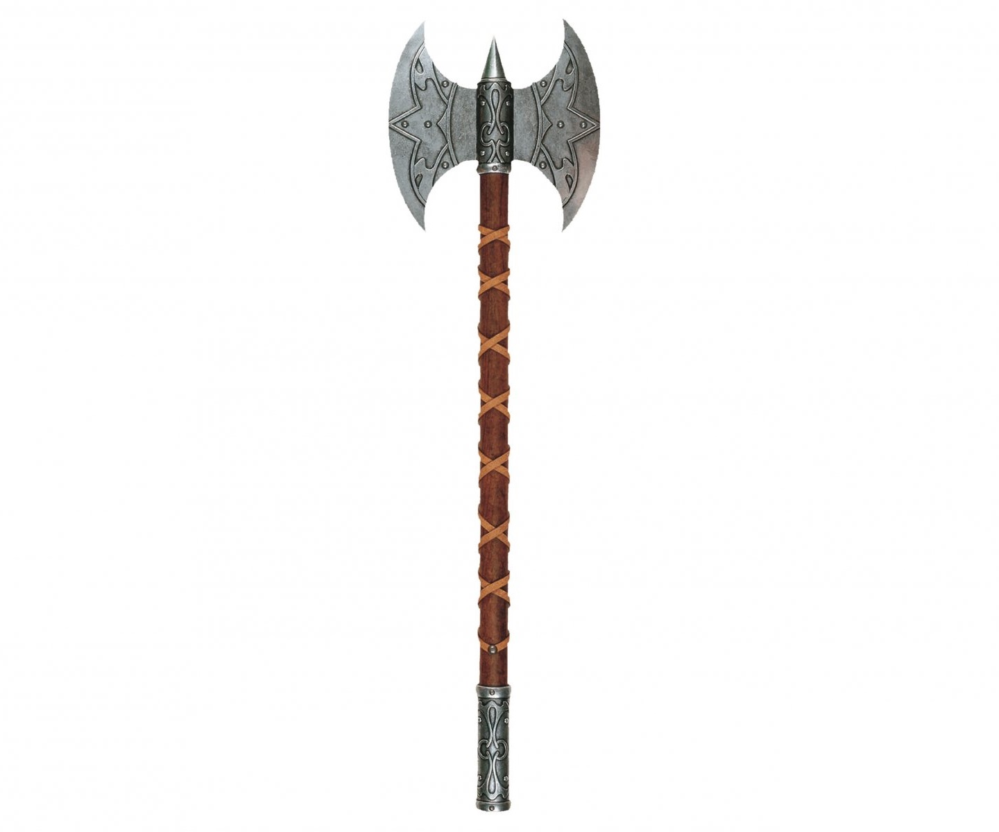 Секира валькирий выполнена в точном соответствии с историческим оригиналом. Древко этого оружия имеет имитацию обмотки, препятствующей скольжению оружия в руке воина. Лезвие выглядит острым, однако на самом деле оно не заточено и в принципе его заточка невозможна, поэтому такой экземпляр будет совершенно безопасным приобретением. На лезвие с двух сторон нанесен незамысловатый выпуклый рисунок. Длина оружия с топорищем составляет 71 см, вес – 1,38 кг.