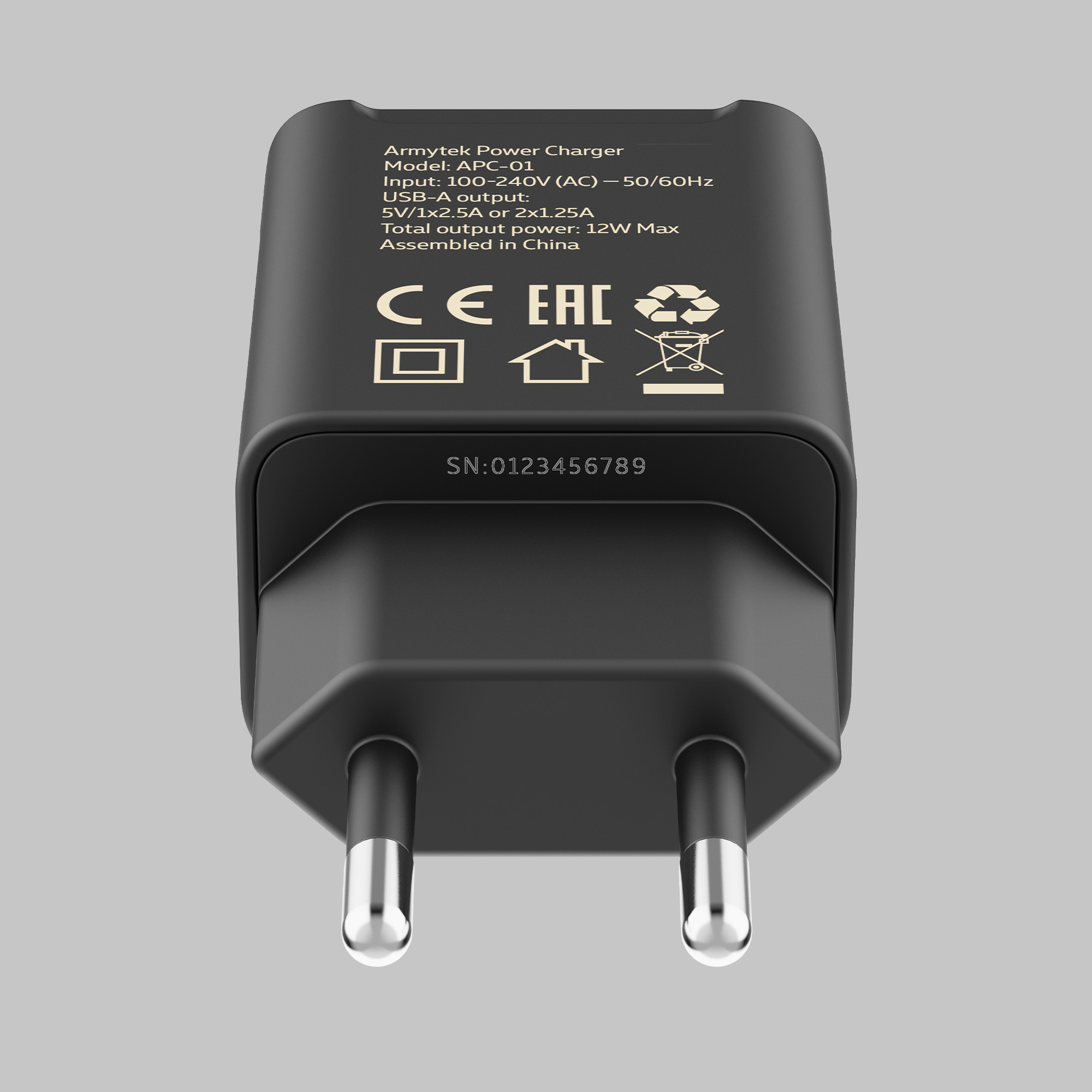 Компактное сетевое зарядное устройство с двумя разъемами USB-A для зарядки портативных устройств с потребляемым напряжением 5В и потребляемой силой тока до 2.5А. Совместимо с устройствами различных типов. Работает от сети 100-240В (AC), 50/60Гц.