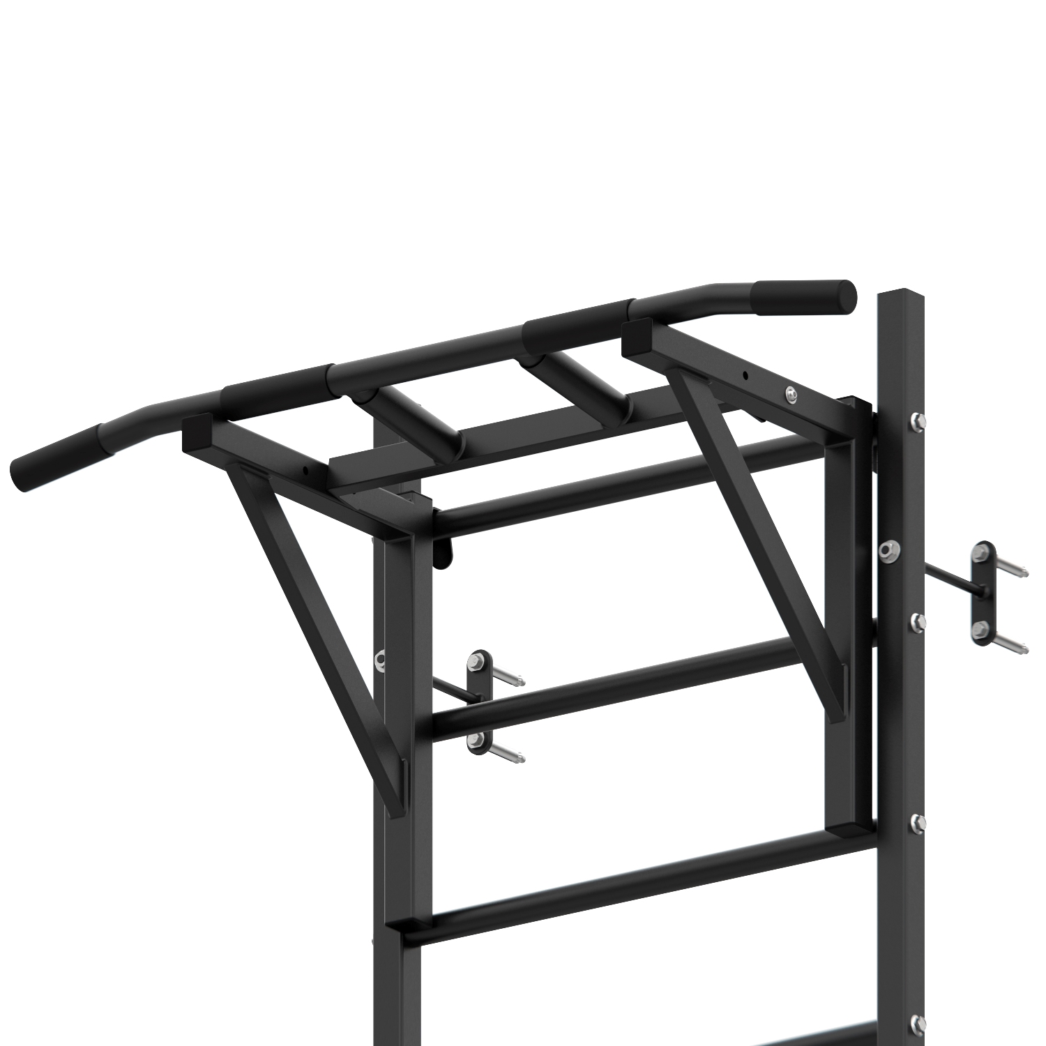 Турник длиной 110 см оснащён мягкими неопреновыми ручками, очень легко перевешивается на перекладины шведской стенки, что позволяет менять его высоту. Расстояние от ручек турника до шведской стенки (вынос турника) - 51 см.