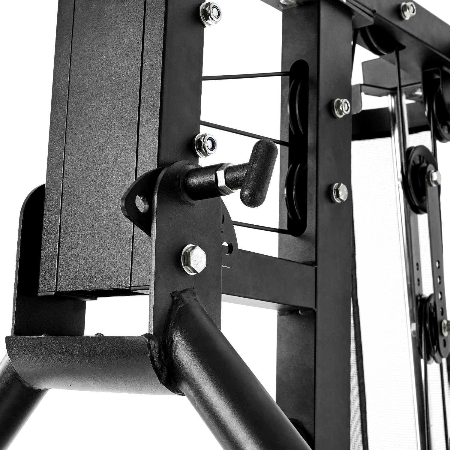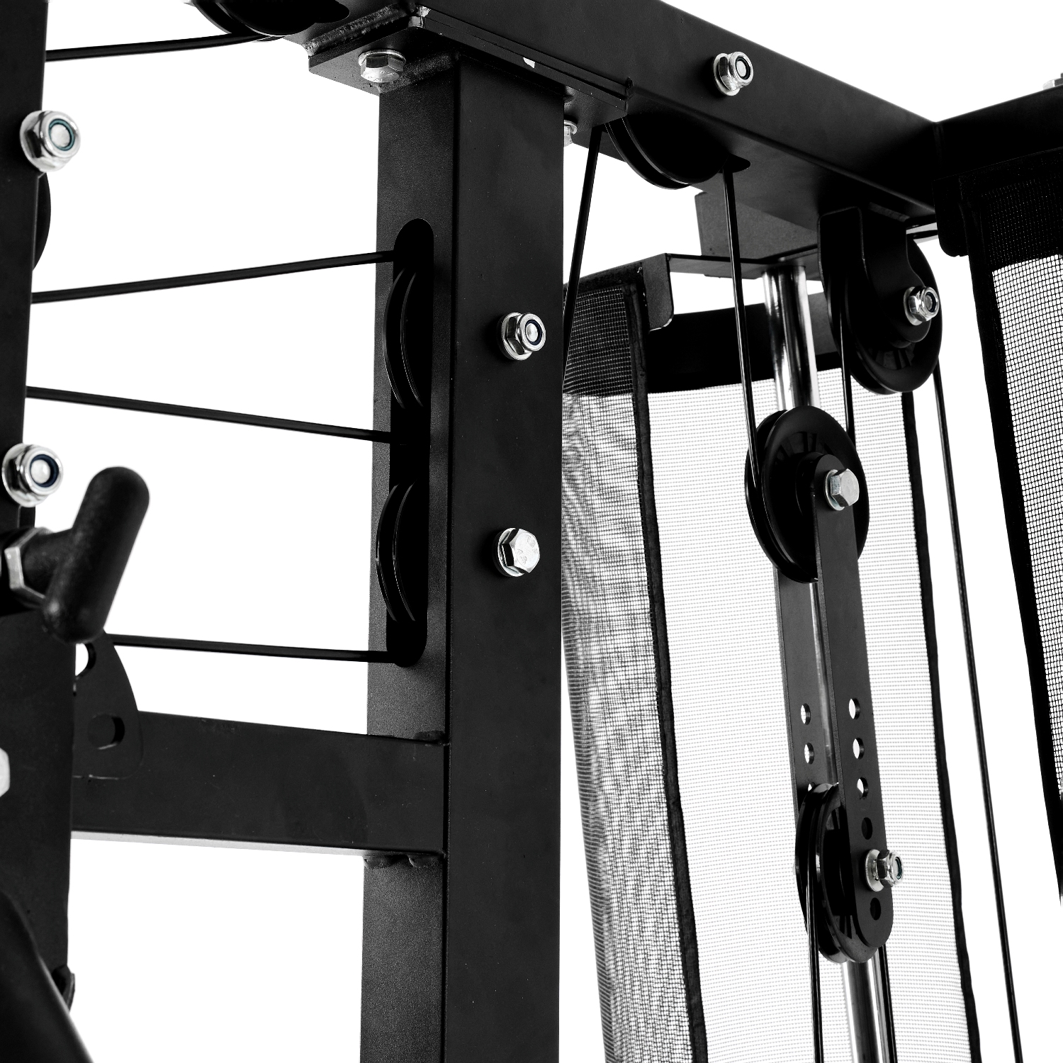 Комплекс DFC D5125 для домашнего использования предназначен для прокачки всех групп мышц: рук и верхнего плечевого пояса, спины, грудных мышц, пресса, ног. Позволяет выполнять силовые упражнения с разным функционалом для наилучшей эффективности тренировки. Сиденье, спинка и гиперэкстензия обиты нескользящим полипропиленом чёрного цвета с оранжевыми вставками. Максимальный вес пользователя — 200 килограмм. *Детали 71 и 74 являются опционными и в комплект поставки не входят. Опции силового тренажёра: Верхняя тяга (W-образный гриф в комплекте) . Ручки грифа рифлёные, с нескользящей поверхностью. Максимальная нагрузка — 130 кг. Используется для тренировки мышц рук (бицепс, трицепс) и спины. Гребная тяга. Переключатель жима от груди и гребной тяги. Тяга снизу. Используется для силовых упражнений на мышцы спины, бицепса, ног. Для комфорта и безопасности предусмотрена платформа с рифлёной поверхностью. Рукоять с нескользящим покрытием входит в комплектацию. Баттерфляй . Используется для тренировки большой грудной мышцы (в том числе стернального участка), малой грудной и мышц ключичного отдела, а также мышц рук: бицепс, трицепс, брахиалис, лучевой разгибатель кисти. Максимальная нагрузка — 130 кг. Ремень для тренировки спины . Используется верхнее крепление: упражнения выполняются по типу тяги верхнего блока с опорой на гиперэкстензию и металлическую платформу. Позволяет прокачать мышцы груди, трапеции, пресса, спины, шеи. Скамья со спинкой, гиперэкстензия, съёмные валики . Такой набор позволяет тренировать большую группу мышц спины, ног, рук, пресса, груди. Удобное расположение гарантирует правильное положение тела во время тренировок и эффективность выполнения упражнений. Есть ограничение по нагрузке: 250 кг для спинки, 200 кг для сиденья, 150 кг для гиперэкстензии (используется как подставка для упражнений на бицепс).