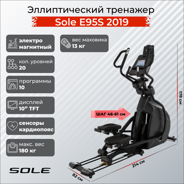 Эллиптический тренажер Sole E95S 2019.Представляем один из самых лучших эллиптических тренажеров с электрической регулировкой длины шага. Которая обеспечивает комбинацию преимуществ занятий как на эллиптическом тренажере, так и бегом. Регулируйте длину шага одним нажатием клавиши и выведите ваши тренировки на совершенно новый уровень.Длинный шаг имитирует нагрузку получаемую во время бега, которая очень эффективна, но в то же время без ударной нагрузки на суставы. Короткий шаг позволяет эффективно проработать ягодичные мышцы и мышцы задней части бедра. Разные пользователи имеют разный рост и соответственно оптимальную длину шага, это больше не является проблемой подбора правильного тренажера, E95S подойдет любому пользователю. Регулировка шага поможет подобрать оптимальную длину, обеспечивая максимальную эффективность и комфорт тренировки.К дополнению к электрически регулируемой длине шага, Sole E95S оснащен тяжелым маховиком с высокой плавностью хода, большими ножными педалями из мягкого пластика, ярким 10,1" TFT дисплеем и выполнен в удобном эргономичным дизайне.Максимальное удобство и комфорт.Удобная панель управления с интуитивно понятным расположением клавиш. Широкий 10" TFT монитор, встроенные вентиляторы обдува и аудиосистема с подключаемым mp3-плеером сделают ваши тренировки максимально комфортными.Технология Bluetooth.Эта технология синхронизирует данные тренировки с мобильным приложением на смартфоне. Вы можете использовать как бесплатное приложение Sole, так и одно из популярных фитнес-приложений, например: Fitbit, Record, Mapmyrun или Apple Health.Усиленная конструкция.Рама выполнена из 38 мм стали, что обеспечивает невероятную прочность и долговечность. Все соединения оснащены усиленными подшипниками, а движение педалей происходит по двойным направляющим для более стабильной фиксации и предотвращения боковых раскачиваний.Уникальная технология отрицательного угла педалей.Уникальная технология отрицательного внутреннего угла –2? снимает нагрузку со связок коленного и голеностопного суставов, обеспечивая максимальную безопасность занятий. Конструкция педалей разрабатывалась в тесном взаимодействии с врачами, с учетом правильной биомеханики движения.Тяжелый маховик.Благодаря инертному маховику весом до 13 кг и электромагнитной системе сопротивления движение выполняется максимально плавно и комфортно. По этому параметру эллиптические тренажеры SoleFitness сопоставимы с тренажерами коммерческого уровня.