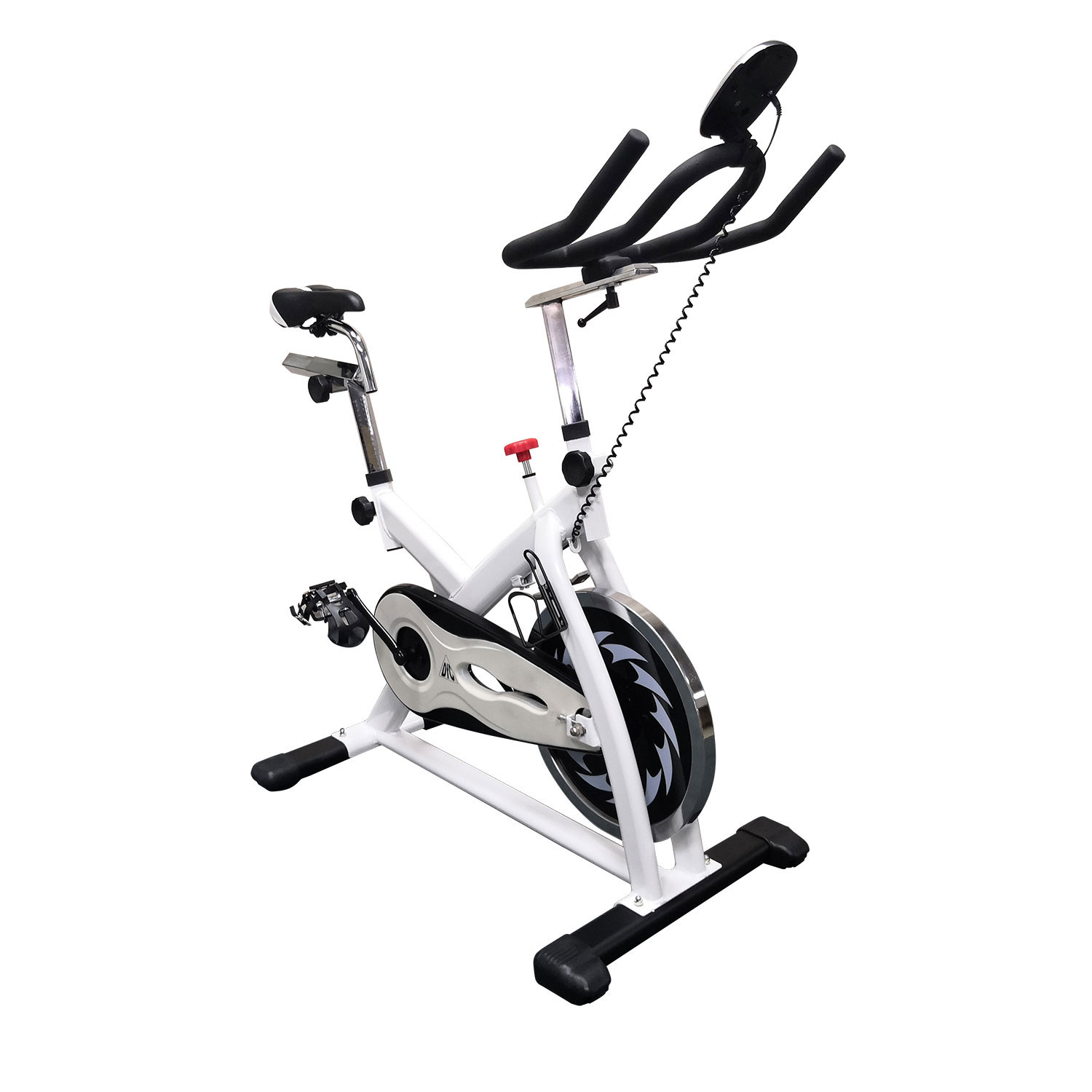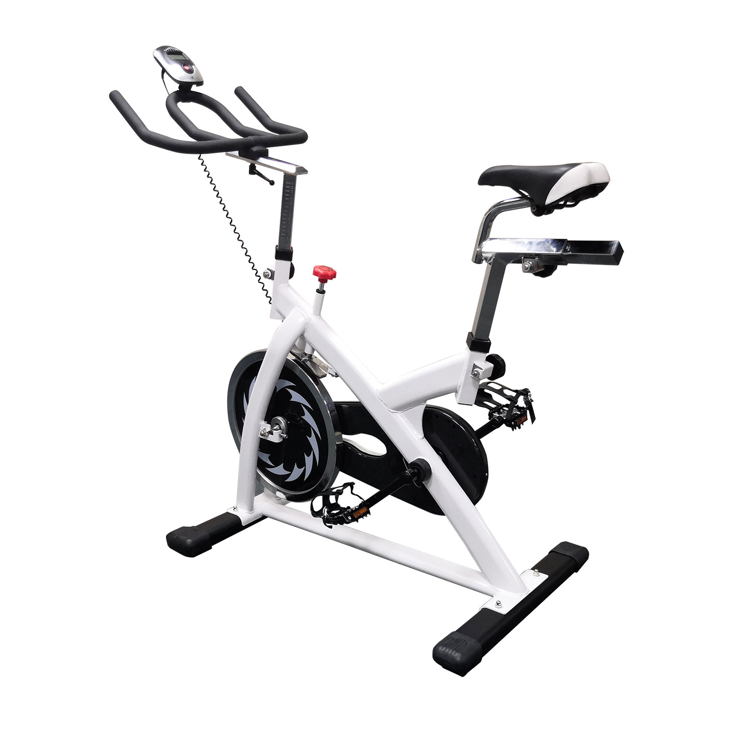 Вертикальный механический спин-байк с ременным типом привода и колодочной системой нагружения. Изменение нагрузки с помощью удобной рукоятки на корпусе тренажера. Предусмотрен экстренный тормоз. Спортивное сидение регулируется в вертикальной и горизонтальной плоскости, и позволяют подобрать удобную посадку для тренировки. Питание компьютера от батареек (тип ААА, 2 шт). Показания консоли: время, скорость, расстояние, калории. На раме установлен держатель для бутылки. Для перемещения тренажера в помещении установлены колеса. Фиксация ног в педалях с помощью резиновых ремней с регулировкой.