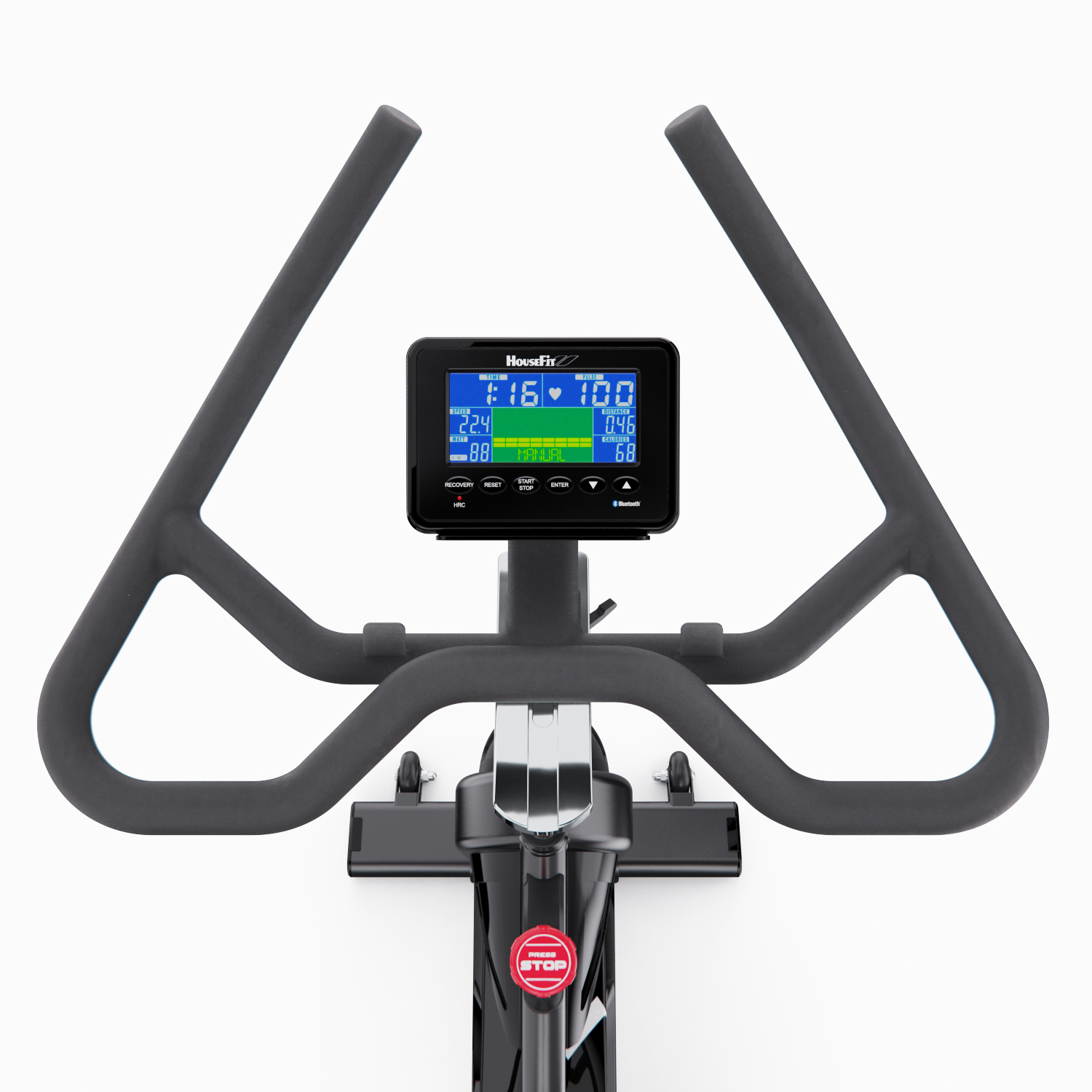 На LCD-дисплее с синей подсветкой отображаются все необходимые параметры: скорость, время, дистанция, сожжённые калории, мощность (ватт), обороты в минуту и пульс (для измерения пульса необходимо использовать нагрудный ремень, не входит в комплект). Консоль включает 6 тренировочных программ: ручной режим, начинающий, продвинутый, спортивный, кардио и режим энергопотребления (ватт). Поддержка Bluetooth и приложение iConsole позволяют отслеживать прогресс в режиме реального времени и сохранять данные тренировок.