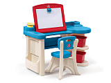 широкая основа - обеспечивает устойчивость; большие боковые ящики для хранения рисунков, книг, бумаги и т.д., большая рабочая поверхность 33 х 51 см; 2 больших контейнера для хранения красок, ножниц, клея и т.д.; отделения для стаканов под фломастеры, кисточки, карандаши и т.д.;