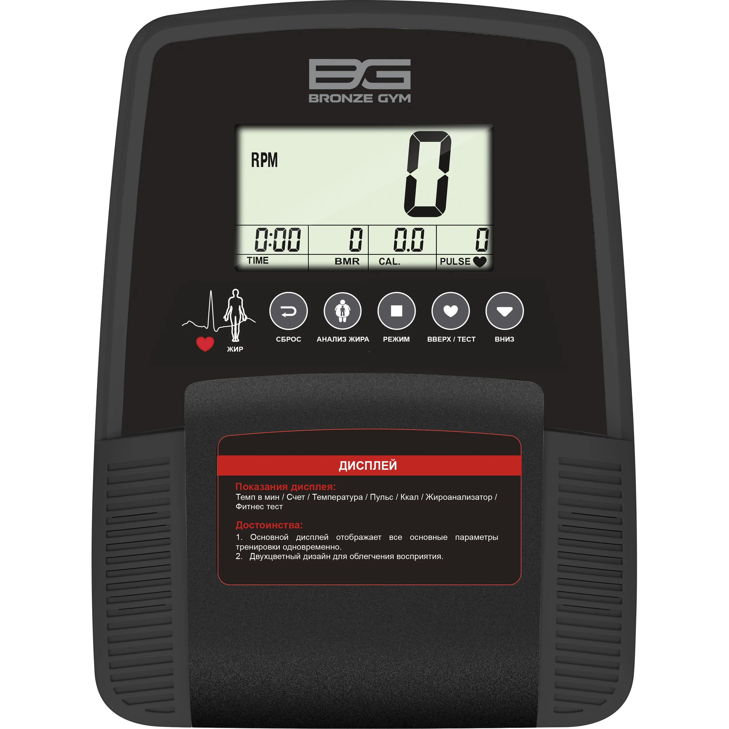 Тренажеры бренда BRONZE GYM – это, прежде всего, надежность, безопасность, и эффективность тренировок. Они подходят для выполнения упражнений, как опытными спортсменами, так и начинающими пользователями. Результатом многолетней работы инженеров-конструкторов и дизайнеров бренда стала выпускаемая продукция, отличающаяся строгим дизайном, прекрасной биомеханикой и предотвращением нежелательных нагрузок на суставы. BRONZE GYM ST700M – это профессиональный степпер, способный выдерживать максимальные нагрузки пользователей в режиме нон-стоп. В основе надежной конструкции - высокопрочная рама с двухслойной покраской. Все изделия массивные и тяжелые, что говорит о фундаментальности бренда. Степперы являются одними из самых безопасных видов кардио оборудования. ST700M не является исключением. Тренажер создан для занятий с низкой ударной нагрузкой на суставы и позвоночник. За счет своей конструкции и отлаженных биомеханических свойств достигается более мягкое воздействие на проблемные участки. Колени не перегружаются и акцент сосредотачивается на самих мышцах. Степпер оснащен магнитной системой нагружения. Маховик, весом 15 кг, позволяющей сделать ход плавным и разнообразить интенсивность тренировок. Для удобства, на оборудовании установлены прорезиненные педали увеличенного размера, которые покрыты антискользящим материалом. Высота шага для ST700M составляет 400 мм. Пользователи могут воспользоваться преимуществами рукояток, на которых расположены сенсорные датчики пульса. Горизонтальные и вертикальные поручни позволяют держать руки в разных положениях и обеспечивают устойчивость пользователя при выполнении упражнений, а также при подходах к спортивному снаряду. Тренировочный компьютер представлен многофункциональным LCD-дисплеем, отображающий 5 параметров одновременно. На экран компьютера выводятся все основные данные – время, счет, дистанция, пульс, темп/мин, фитнес тест, жироанализатор, метаболические индексы (BMI, BMR), температура в помещении. К числу дополнительных преимуществ модели относится специальный держатель для мобильных устройств, а также держатель для бутылки с водой. Плюс ко всему, есть компенсаторы неровностей пола и транспортировочные ролики, со специальной рукояткой на тренажёре для удобства перемещения.