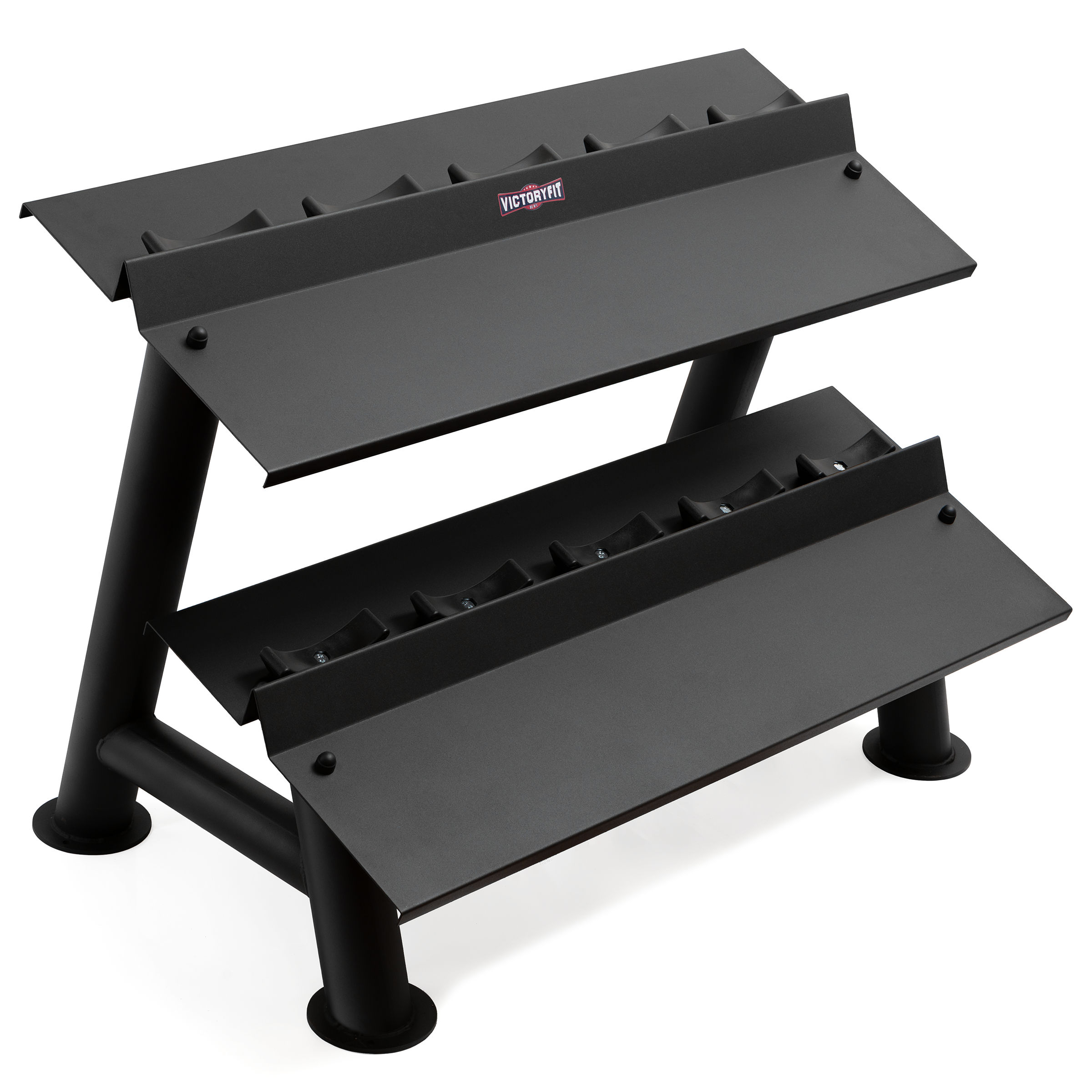 Стойка для гантелей VictoryFit VF-T400. Изготовлена из стали СТ3. Предназначена для размещения 5 пар гантелей. Индивидуальный ложемент для каждой гантели. В конструкции предусмотрено крепление к полу. При необходимости, ширина стойки может быть увеличена за счет дополнительных секций VictoyFit VF-T410. По желанию, цвет стойки может быть изменен.