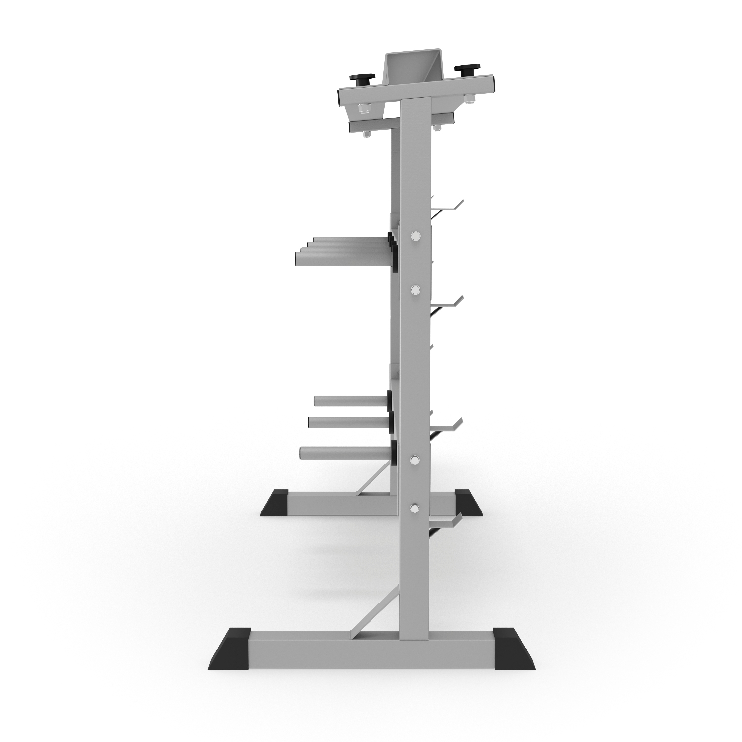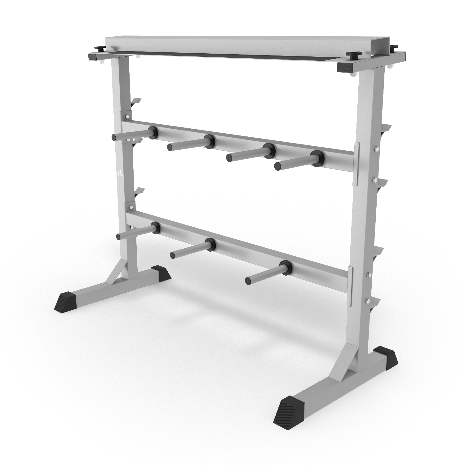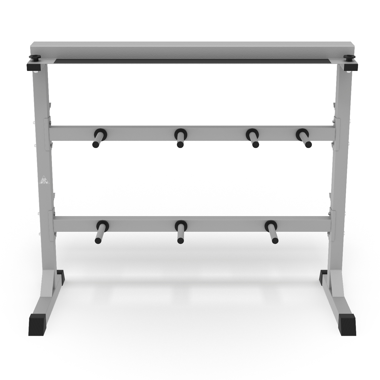Подставка под гантели выдерживает нагрузку до 200 кг, держатели для дисков – до 100 кг. На стойке 7 посадочных мест для дисков. Помимо дисков и гантелей, на стойке возможно разместить 4 грифа без дисков длиной от 120 см.