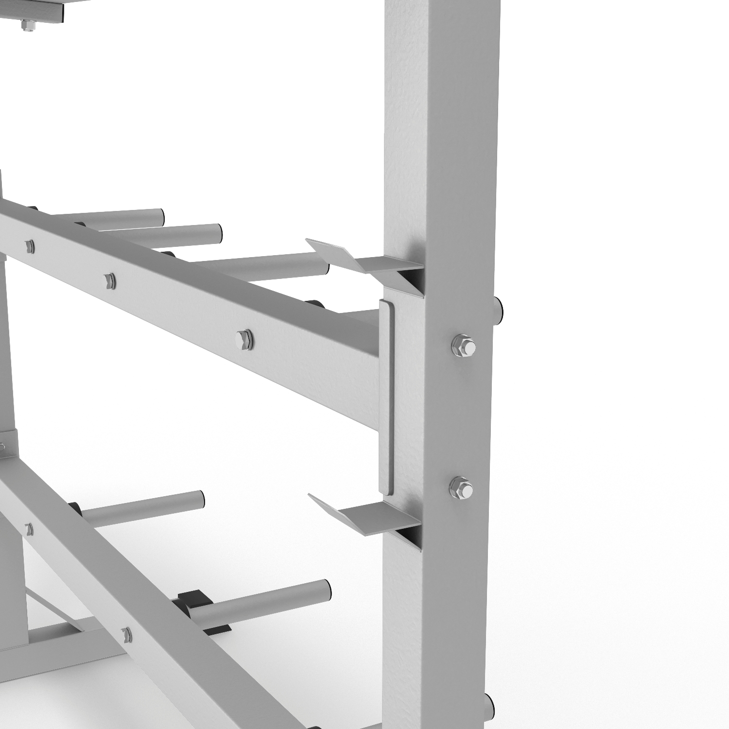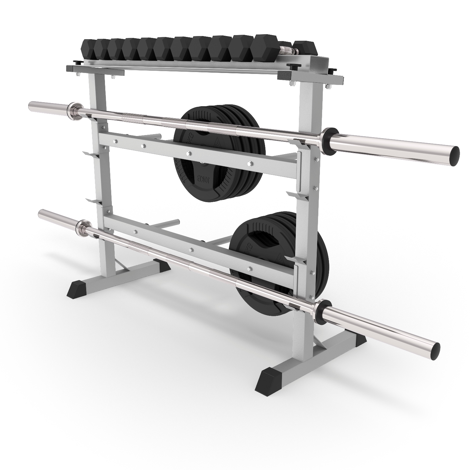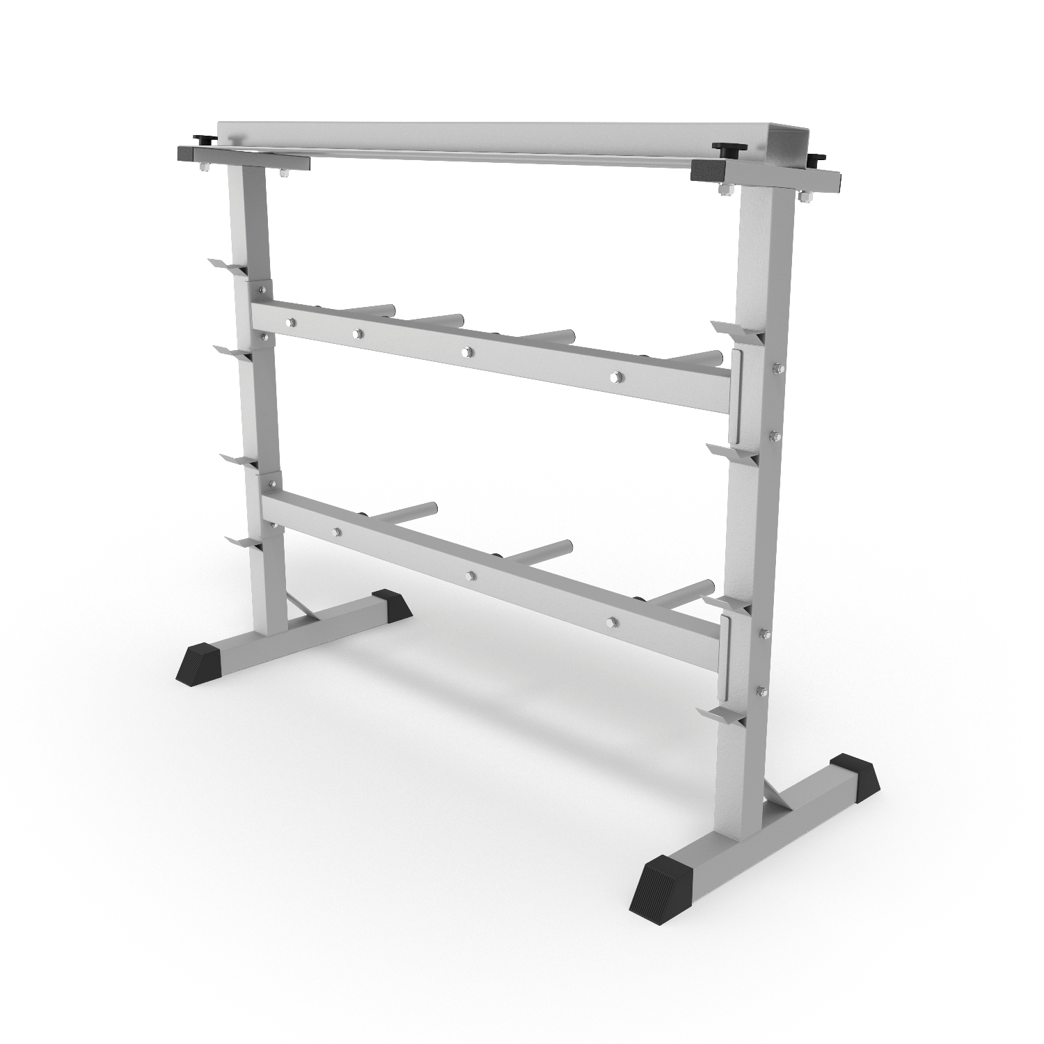 Подставка под гантели выдерживает нагрузку до 200 кг, держатели для дисков – до 100 кг. На стойке 7 посадочных мест для дисков. Помимо дисков и гантелей, на стойке возможно разместить 4 грифа без дисков длиной от 120 см.