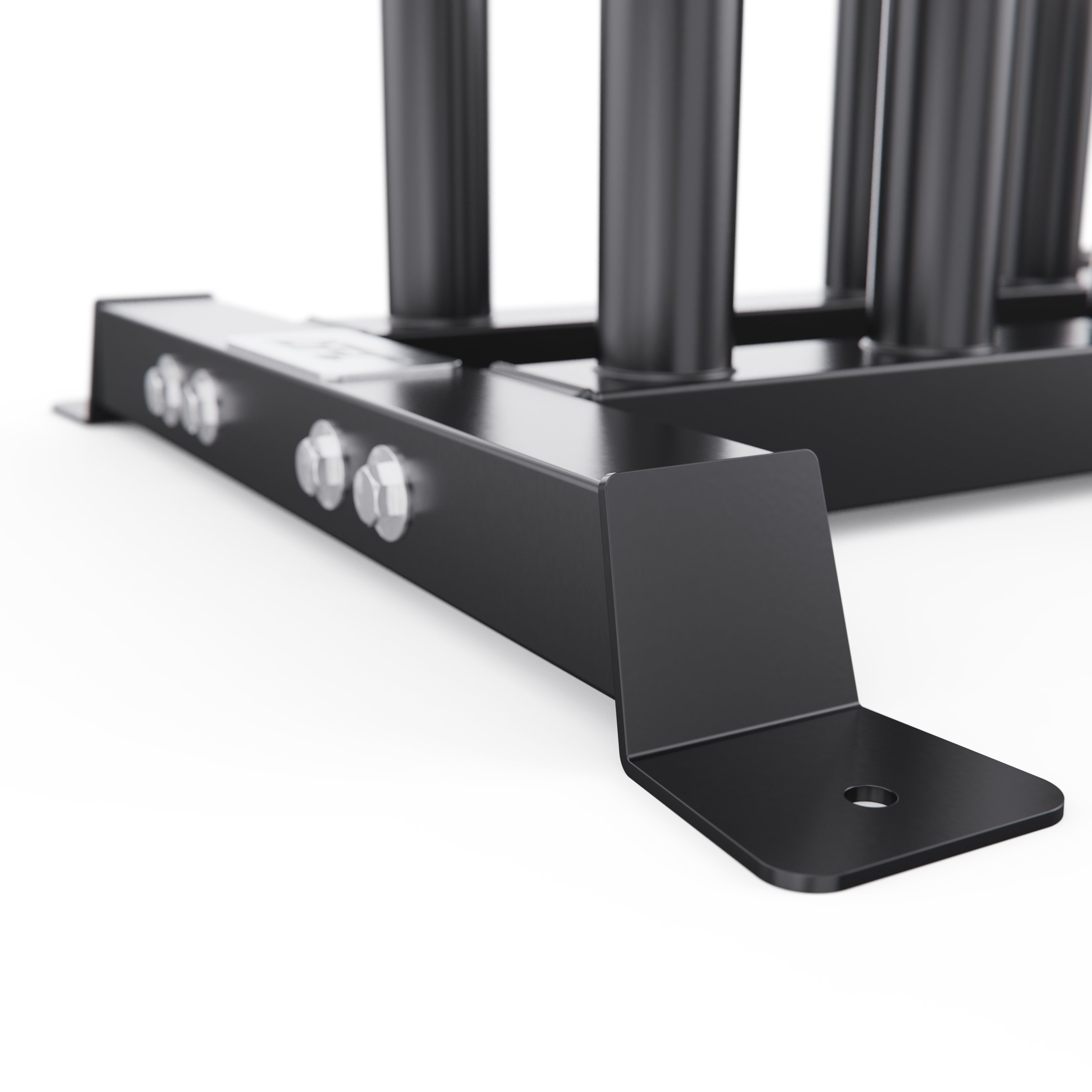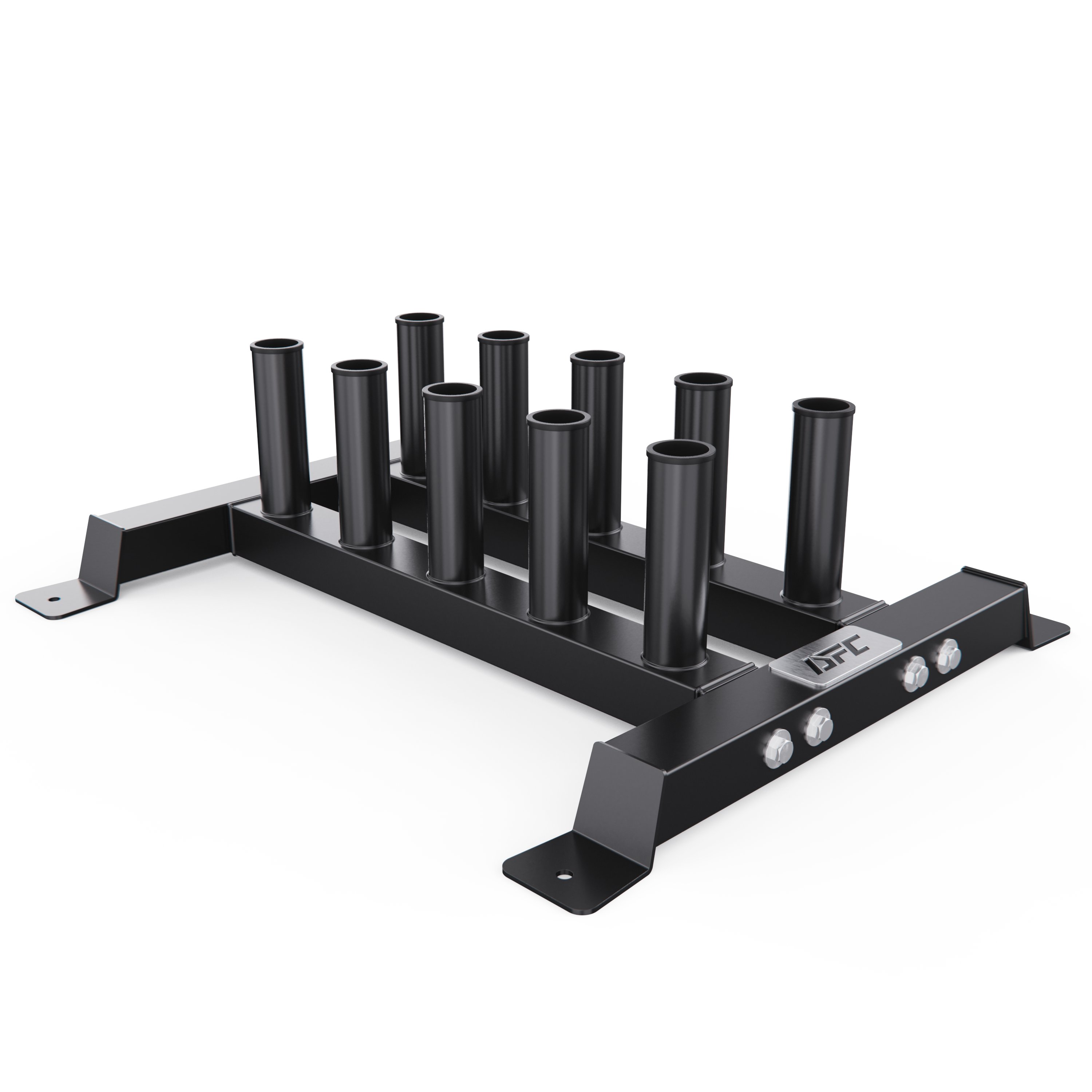 Диаметр посадочных труб составляет 50 мм, что соответствует стандарту олимпийских грифов. Стойка выдерживает максимальную нагрузку до 250 кг, обеспечивая безопасное хранение тяжелых спортивных снарядов.